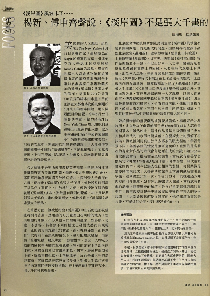 - 1997年〈辨董源溪岸圖絕非張大千偽作〉;