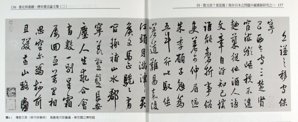 最後再從刻本每每調整行款的斜正,以及變更原來紙張接縫及騎縫印的位置等等,來為「故宮本」與〈水鏡堂本〉之間的母子關係釋疑,並且將墨跡本的下限年代依邵葉的印章定於北宋末的1096年,至於是否為懷素真跡尚不能定。