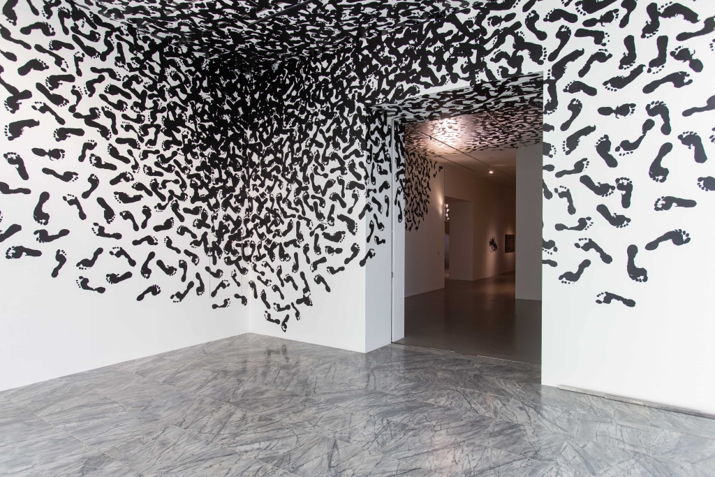 巴西藝術家蕾琴娜·希維拉(Regina Silveira)《入侵系列:冒險故事》為2006年參加台北雙年展的觀念性作品重製,佈滿天花板與牆面的黑色腳印引發不同視角的豐富想像,彷彿也代表著從整個展覽開首尹錫男作品中籠罩的禁錮氛圍中出走的開放意象。