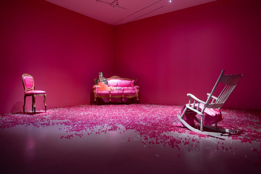 展覽主題「飛地」取其喻義,比喻創作者足以隔絕外界干擾的內在世界,而吳爾芙的《自己的房間》則是策展構思的實質源頭。實際上,吳爾芙在「飛地」展中幾乎是無所不在的存在,就像這位走在二十世紀女性主義風頭浪尖的作家,對於一整個世紀渴望追尋自我的女性具有如導師般的重要位置。在幾乎整整一個世紀前的1928年,她就振聾發聵地提出,若一位女性想要寫作,她需要的是金錢和「一間自己的房間」;不誇張地說,迄今為止這一觀點仍切中要害,甚至,自己的房間、也即獨立的「空間」,對女性創作者而言有時比金錢更得之不易。這次展覽之開篇裝置作品的創作者、被譽為韓國女性主義藝術先驅的尹錫男,就曾在擁有了自己的大工作室後表示「無比幸福與滿足」。