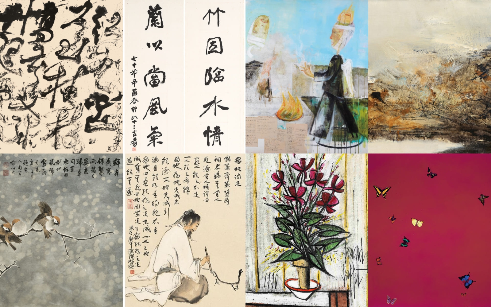 本季拓廣書畫收藏的多元視野。臺灣膠彩前輩林之助1960年作《青蛙》,一青蛙蹲踞於荷葉遠望,白荷盛開挺立,氣氛恬靜優雅,生趣昂然,情調可愛。涂璨琳1990年作《十二生肖》以典故及畫史圖像傳統入畫,動物情態生動又富趣味,本作曾展覽於1991年臺北鴻展藝術中心「吳三連文藝創作獎歷屆得獎人書畫展」。來自卜兹舊藏的丁衍庸《辛夷雙雛圖》深具筆墨意趣,與卜茲書法藝術內在之神遇偶合。當代水墨則以于彭為突出焦點,《覺者系列》、《水漫山澗重重開之二》、《筆墨微觀》、《花間一壺酒之三》,均附藝術家親簽原作保證書,皆屬其本色風格代表之作。