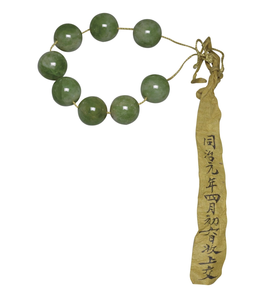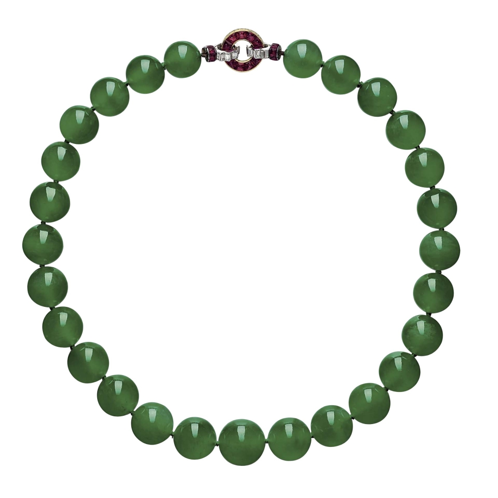 巧合的是,卡地亞不久後再次接受到名媛芭芭拉.赫頓(Barbara Woolworth Hutton)父親訂單,這件訂製首飾的主石為翡翠玉珠,是給女兒和喬治亞王子亞歷克西斯.姆迪瓦尼(Alexis Mdivani)的結婚禮物。玉珠總計27顆,大小落在15.40至19.20 公釐之間,有上等翡翠的帝王綠色和晶瑩剔透的質地,推測可能是清末宮廷流出的精品。1924年以降,前清皇室內務府為應對末代皇帝婚禮造成的債務,兩度將清宮舊藏的珠寶古董抵押,向銀行換取貸款。由於內務府無力償還貸款,1927年銀行將部分品項對外販售,買家中也有來自異國的商人,如美國舊金山的安倍.甘普(Abe Gump)。
