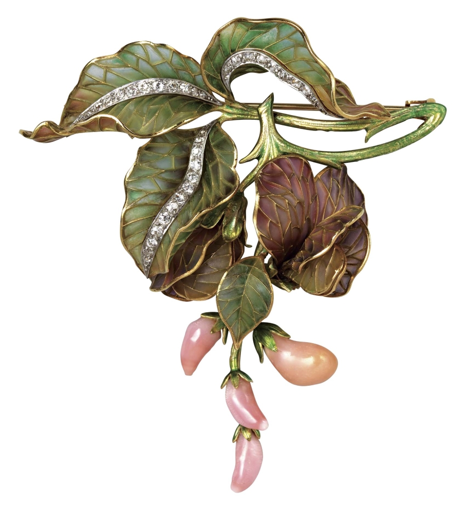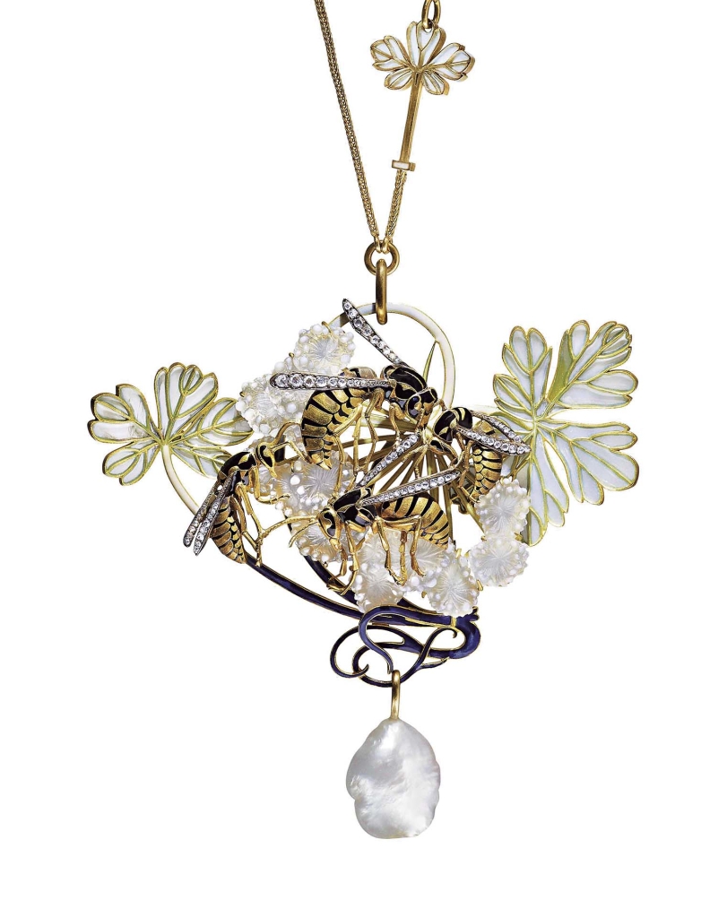 新藝術珠寶將動植物放入裝飾中,代表人物法國設計師勒內.拉利克(René Lalique)運用Plique-à-jour的琺瑯工藝,以更詩意的形式模擬自然色彩。Plique-à-jour的法語意為「讓光透進來」,製作方式類似中國的掐絲琺瑯,將玻璃質填料放入有底的格框中。不過在燒製成形之後,會用酸洗掉底背,成品呈現一種類似彩色玻璃的效果。勒內.拉利克的美學可謂歷久彌新,2017年秋季佳士得日內瓦拍賣中的〈琺瑯、鑽石和珍珠吊墜項鍊〉更立下設計師個人紀錄的里程碑。此作有設計師「Lalique」簽名,推測是1899至1901年間的作品,項鍊墜子設計成四隻帶鑽石翅膀的金色黃蜂懸掛在山楂枝枒,特殊的琺瑯技藝打造出透亮精緻的葉子,下方懸吊巴洛克珍珠,增添造型的豐富度。估價為9萬至13萬瑞士法郎,最終成交在97萬2500瑞士法郎(折合約新臺幣3598萬元),逾低估價十倍。