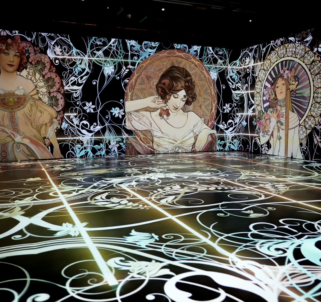 此區將克林姆與慕夏的經典作品拆解重組,結合燈光、投影與音效,為觀眾帶來一場視覺與感官的盛宴。克林姆的金色畫作,營造出夢幻與神秘的氛圍;慕夏以細膩的曲線和花卉裝飾,呈現出浪漫與自然之美。兩位大師風格各異,卻在此交相輝映,讓人沉浸於新藝術的魅力之中。