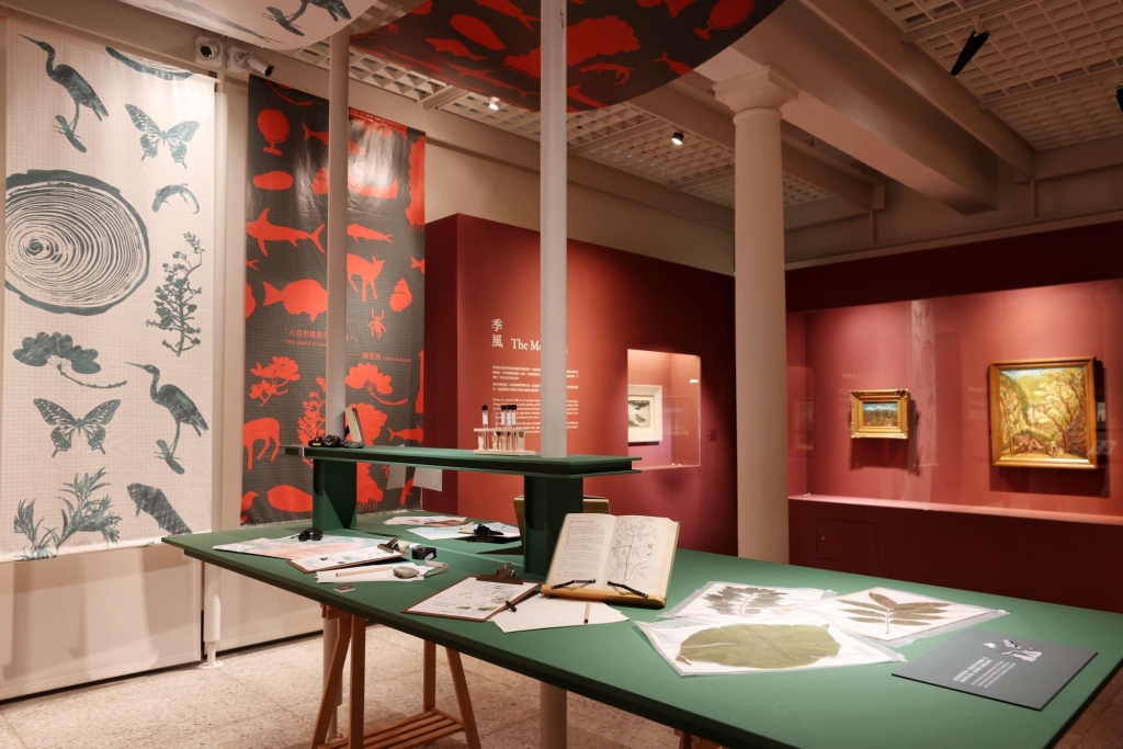 步入展場,我們可以看到畫家繪製《展望諸羅城》前一天的天氣圖,解釋了畫中的積雨雲是颱風外圍環流所帶來的。羅列的各種動植物標本,將《雲海》和《玉山積雪》中季風所帶來的霧林生態生動地呈現在我們眼前。