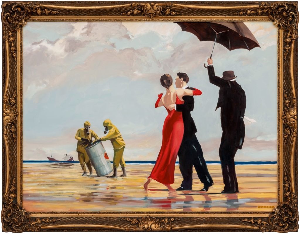 本場另一焦點作品為美國搖滾樂團Blink-182創始團員主唱兼貝斯手Mark Hoppus釋出的《Crude Oil(Vettriano)》,此作為Bansky在2005年罕見全以手繪完成的作品,描繪著一對在海灘上共舞的情侶,然而背景卻可見沉沒的油輪與兩名穿著防護服的男子推著有毒廢物。對應如今自然災害日益頻繁的現況,尤其是之前的洛杉磯野火災情更令人感到警醒,Hoppus也於拍前即表示,部分收益將捐贈給洛杉磯醫療慈善機構與加州消防基金會,最終由英國買家透過線上出價以426萬英鎊(約合542.8萬美元)競得。