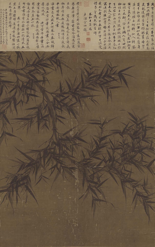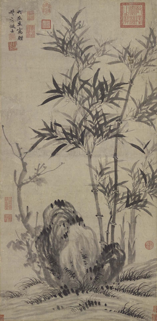 現知最早單以竹入畫的作品可能是《歷代名畫記》第六卷中記載的王獻之(344-386)《竹圖》。而五代的徐熙(886-975)以粗筆濃墨的野逸聞名,《圖繪寶鑑》中記載許多宋代以竹畫聞名的畫家都承徐熙畫風。宋代的竹畫尤其興盛,在《宣和畫譜》分出墨竹一科,其中以文同(1018-1079)畫竹(圖1)最為知名。根據蘇軾《文與可畫篔簹谷偃竹記》中轉述,文同有一套畫竹的心訣:「故畫竹必先得成竹於胸中,執筆熟視,乃見其所欲畫者,急起從之,振筆直遂,以追其所見⋯⋯」,強調仔細觀察和落筆節奏。