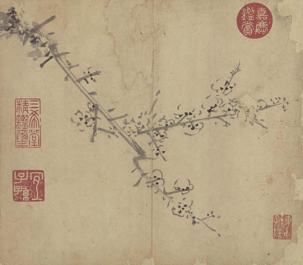 另一位開啟梅畫新法的畫家是南宋揚無咎(1097-1171),據傳他在紹興年間與釋仲仁有過交流。揚無咎首創以近似書寫的圓圈線條來畫梅瓣(圖3),元代的王冕(?-1359)(圖4)與陳立善都隨此畫法,至明代的墨梅名家如陸復和陳栝,也延續此派畫梅傳統且略作變化:陸復以脂粉點染紅梅(圖5),陳栝用迅急筆勢和淋漓水墨精準捕捉梅花造型(圖6)。
