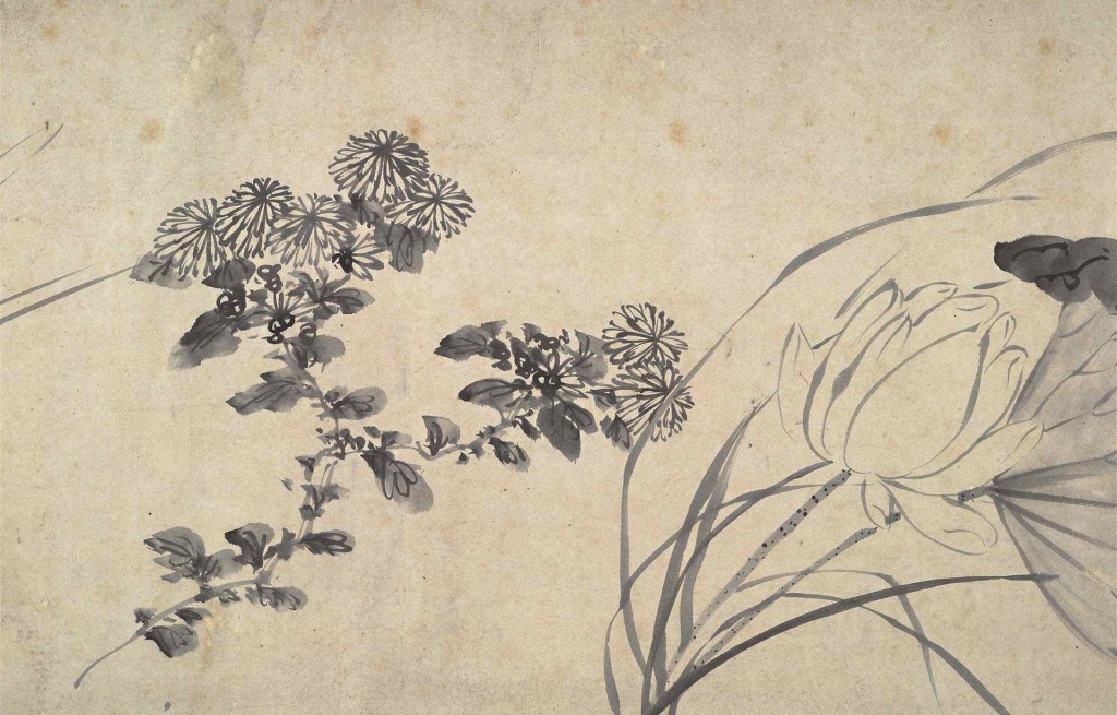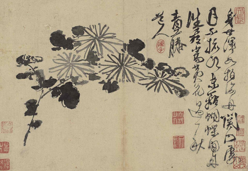 明代陳淳(1482-1544)的菊畫則別具一格,改以墨筆點染花型與葉片(圖10)。與陳淳齊名的畫家徐渭(1521-1593)也同樣寫意畫菊,兩人作品各異其趣,陳淳在花葉形態上多有著墨,徐渭則以墨點和墨暈更加抽象地表現葉片(圖11)。