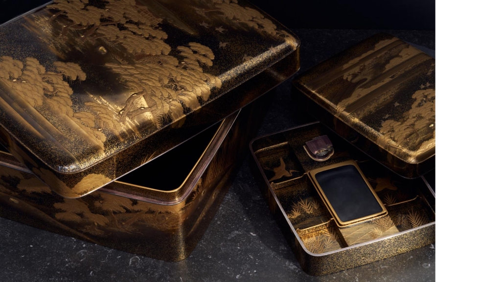 漆器收藏部分得益於與Lesley Kehoe的合作。她是備受日本政府認可的文化大使級畫廊主,致力於在日本發掘珍稀漆藝作品。1987年,透過她購入一對壯麗的江戶時期漆盒,上繪住吉大社松林海岸及其風景。此盒兼具藝術與歷史價值,收藏家以守護者自居,35年來幾乎未曾示人。可以說,它們在長達約250年的歷史中,如今或將首次公開亮相於世人眼前。