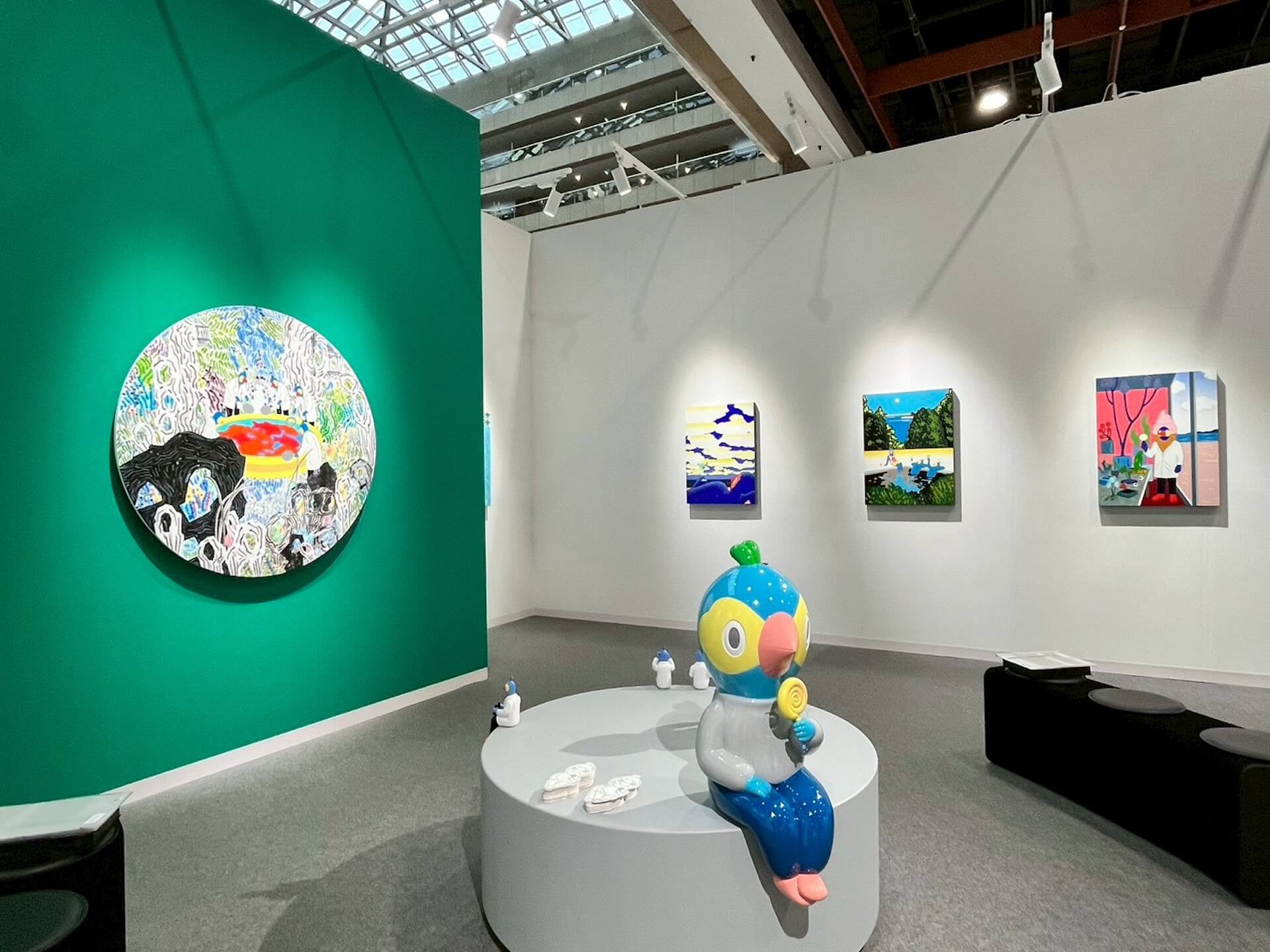 展場最吸睛的莫過於日本藝術家平子雄一(Yuichi Hirako)的雕塑群,他的作品色彩明豔、充滿奇幻感,常常融入日本文化中萬物有靈的信仰,細膩刻畫自然在歷史和宗教上的意義,也探討人類與自然的共存、共生的狀態,尤其在面對全球氣候變遷與災難頻傳的當代,平子雄一的作品也深具有普世的療癒感。同個空間側邊展牆上,展出新藤杏子 (Kyoko Shindo)的作品,她的作品也取材自日本的神話元素,描畫人在大自然中的狀態。雖是以油彩繪製卻擺脫了傳統油畫的厚重感,呈現出類似水彩畫的清透與流動感,給人一種時光拂拭而過的靈動之感。