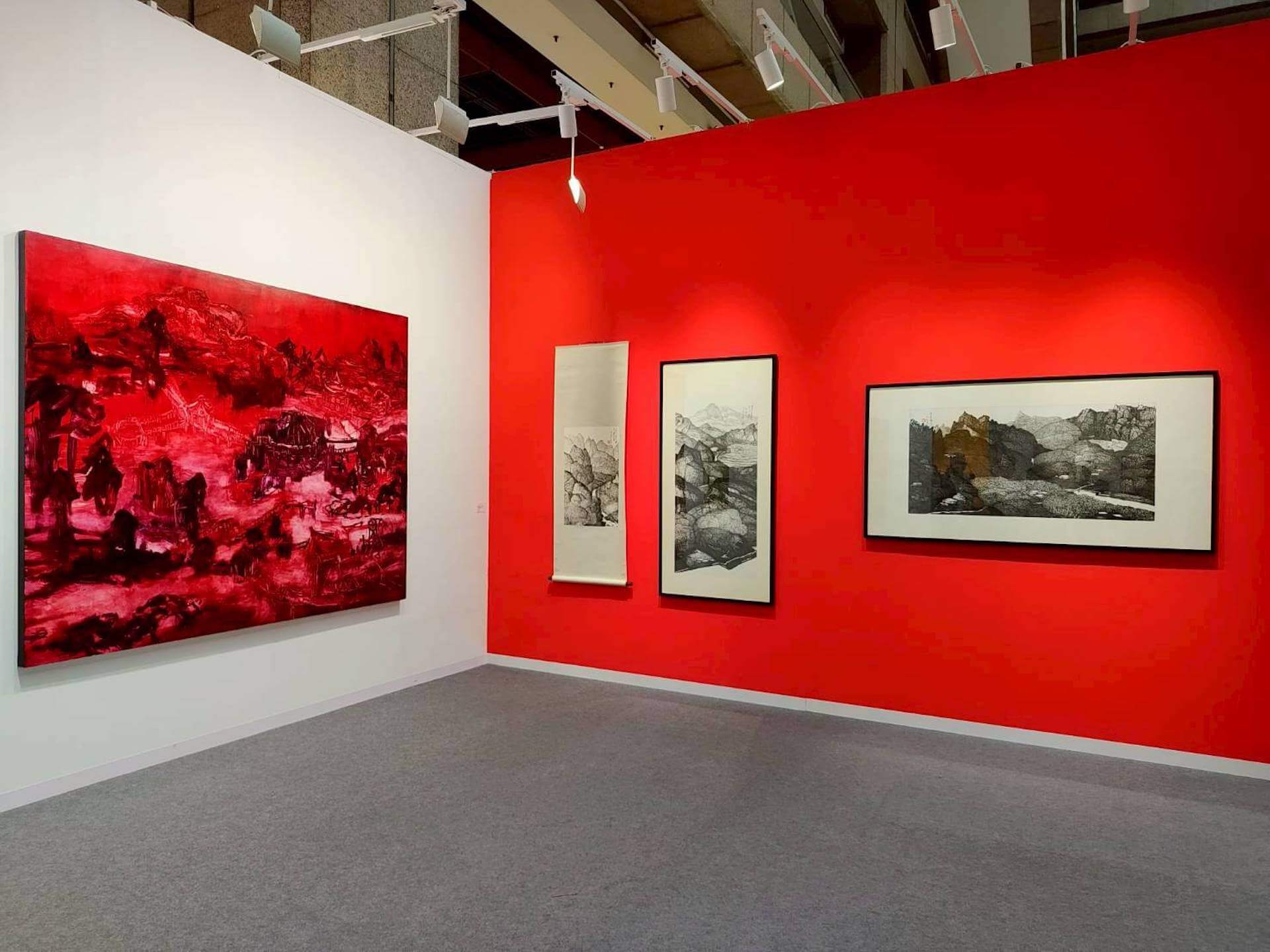 以深厚東方美學底蘊獨樹一幟的異雲書屋,今年精選20世紀水墨藝術重革新者余承堯之黑白書畫作品,主展牆特別以朱砂色映襯其質地綿密之筆墨,一旁的梁兆熙炭筆與偶有的幾抹色彩,古雅雋永蒼茫鮮活 ;長期主打的于彭也未缺席,山林人物畫作兼有;吳士偉惹人憐羡的細筆精卉可以與周川智兀自脫俗的秀雅瓶花相對而觀,一中一西,一約一盛,趣味十足;此外山本尚志簡扼大墨的奇物怪人、劉欣以古書為靈感,自由還魂假想造型的文本再現、常陵的大筆刷芭蕉綠與關渡紅也都不容錯過。新生代藝術家中,來自馬來西亞,定居臺灣的陳睿淵以旅行期間的記憶與窗景,薄暮雲霞映照鄉愁與歸屬感的濃淡苦甜;顏妤庭以書法筆劃構成的變形人物等,反思社群與資訊爆炸對現代人的影響,10位藝術家精妙奇異各有可觀。