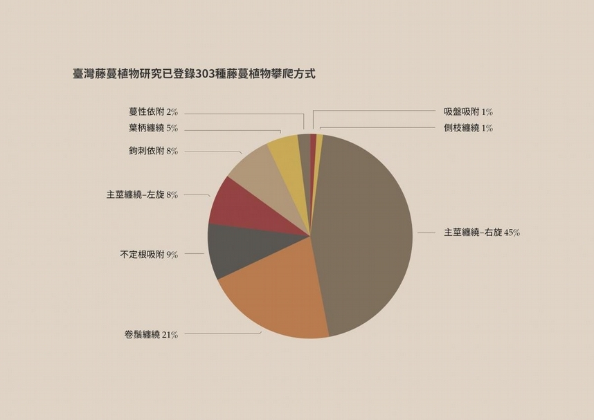 為探討臺灣藤蔓植物如何攀附而上,在我們已收集臺灣303種藤蔓植物中,以主莖纏繞-右旋最常見,占45%;卷鬚纏繞次之,約有21%;不定根吸附則占9%,纏繞方式近10種之多。