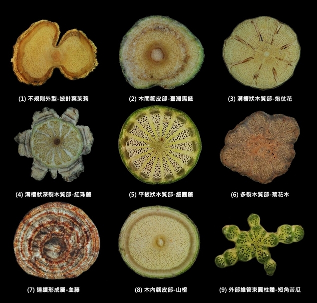 藤蔓植物莖部的內部排列,可不只是依照韌皮部、形成層、木質部(由外而內)乖乖地同心環狀排列而已喔,透過不同組織排列組合,除了產生莖表皮的各式樣貌外,也讓我們在觀察莖部橫切面構造下,對大自然的鬼斧神工,嘖嘖稱奇!