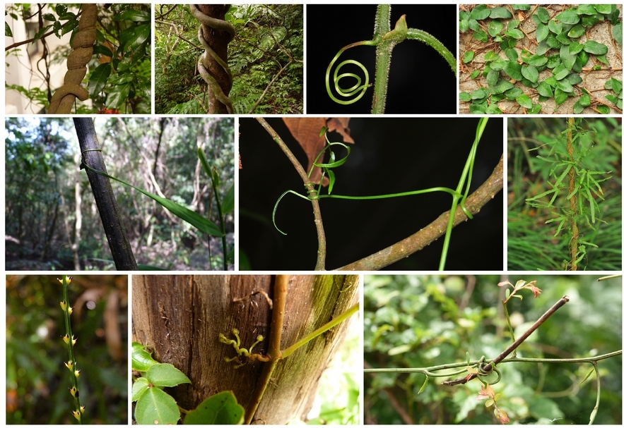 藤蔓植物透過主莖纏繞、卷鬚纏繞、不定根吸附、葉纏繞、鉤刺依附、吸盤吸附、側枝纏繞、蔓性依附等方式攀爬來爭取有限的環境資源。