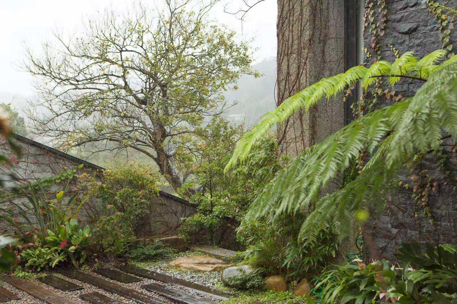 襲園以觀照內在的寧靜,把南側與西側,以牆圍塑,保護了內在空間的舒適感。一座深幽的山林谷地,營造屬於自己的理想境界。襲園向外伸展,彷彿又回到內在世界。