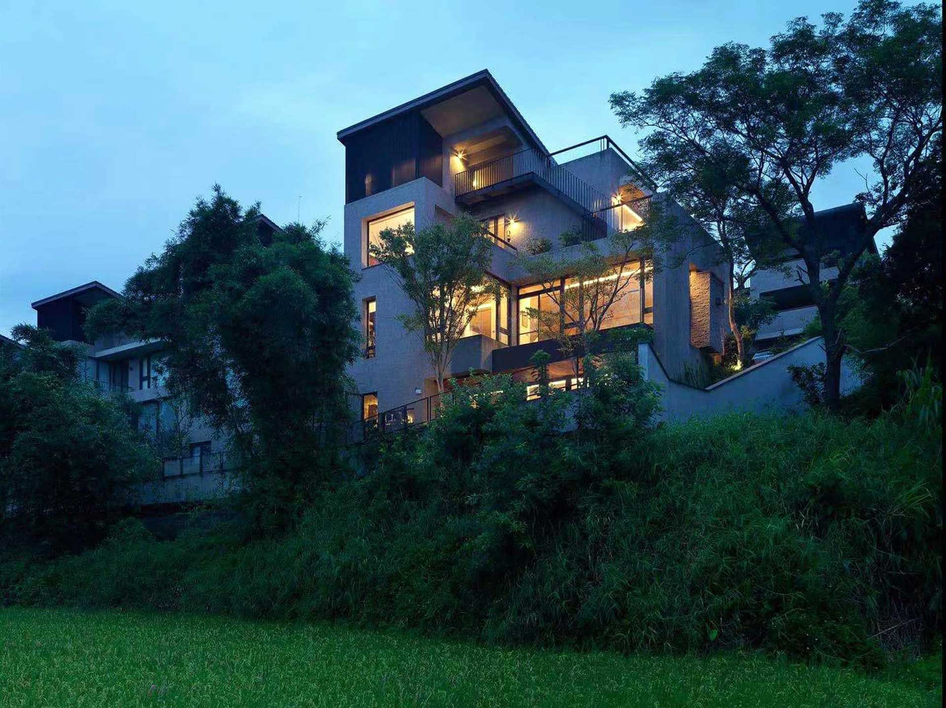 他們描述說,當東方第一道光升起的同時,襲園就用一整棟清水模建築,記錄著日出至日落的軌跡。而夜間的襲園,由於透過外牆的間接打光,讓輕薄的屋簷,呈現出輕盈待飛的樣貌。從室內透出的燈光,搭配室外彰顯建築輪廓的戶外照明,厚實的清水模建築,也顯得晶瑩剔透,美不勝收。