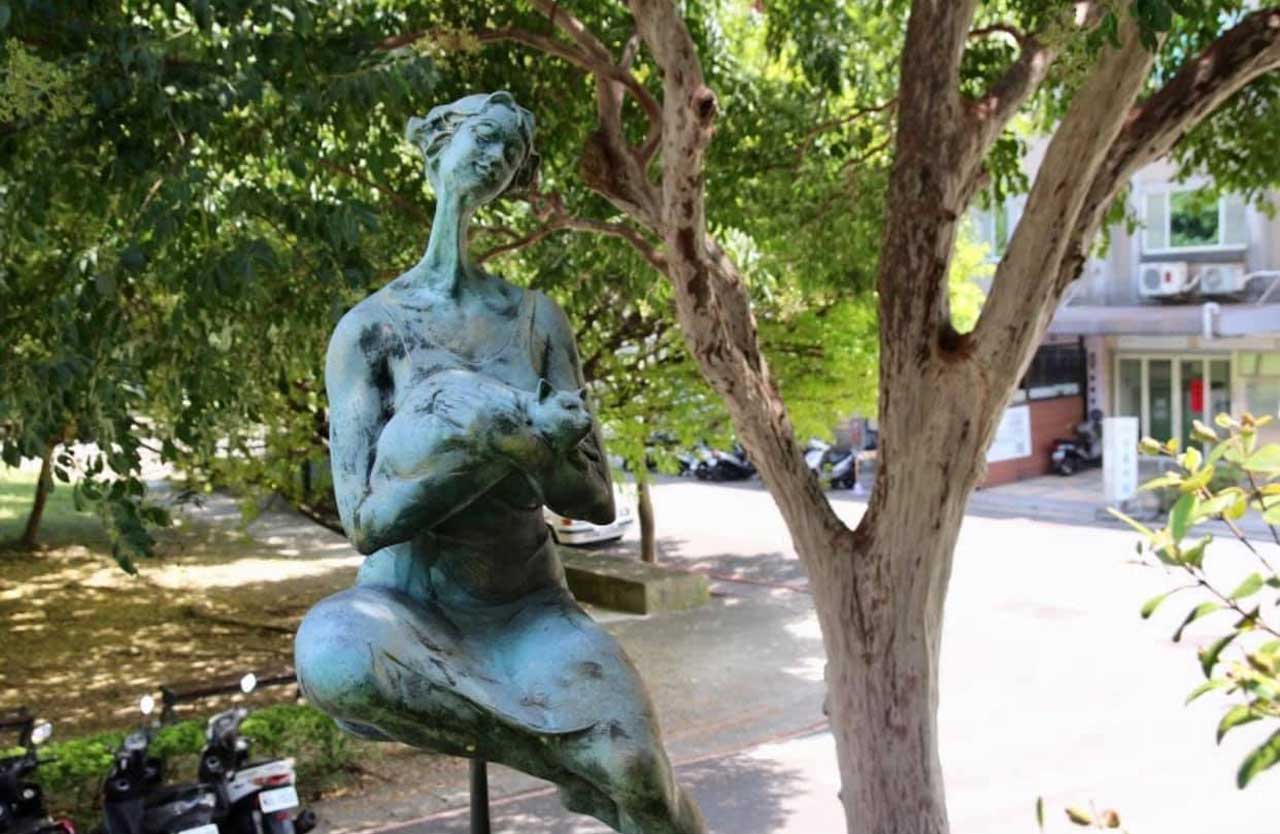 就在2樓,有個凸出來的露台,上面立著一尊抱貓的女人像,寧靜自在。這件銅雕作品叫《愛貓的女人》,是張也的作品。瞬間凝結的動態美感,溢於言表。