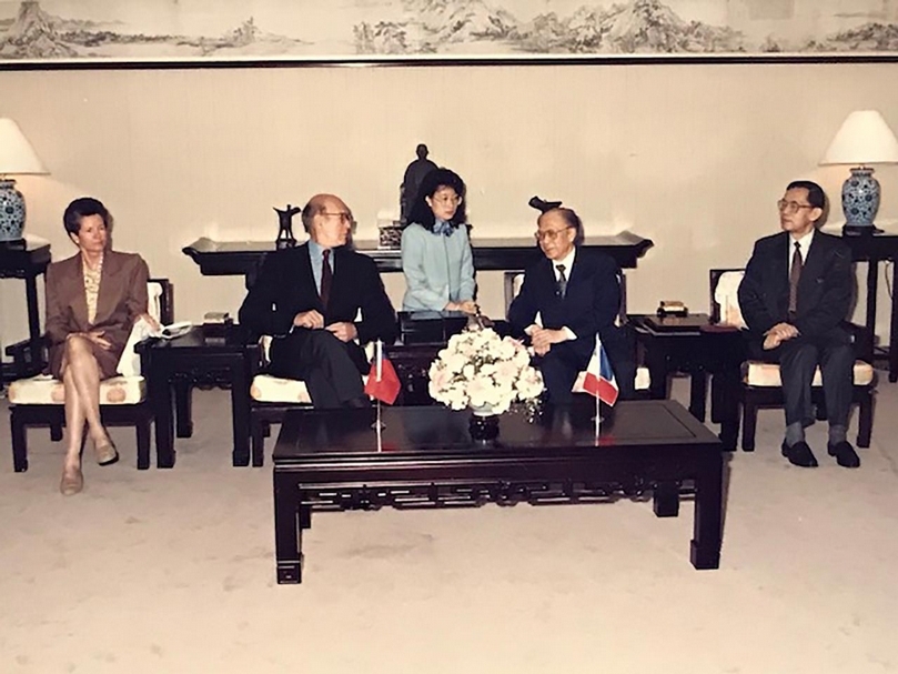 1992年5月6日,故宮前院長秦孝儀接待法國前總統季斯卡.德斯坦伉儷(Giscard d’Estaing) ,由筆者擔任傳譯。(陸仲雁提供)