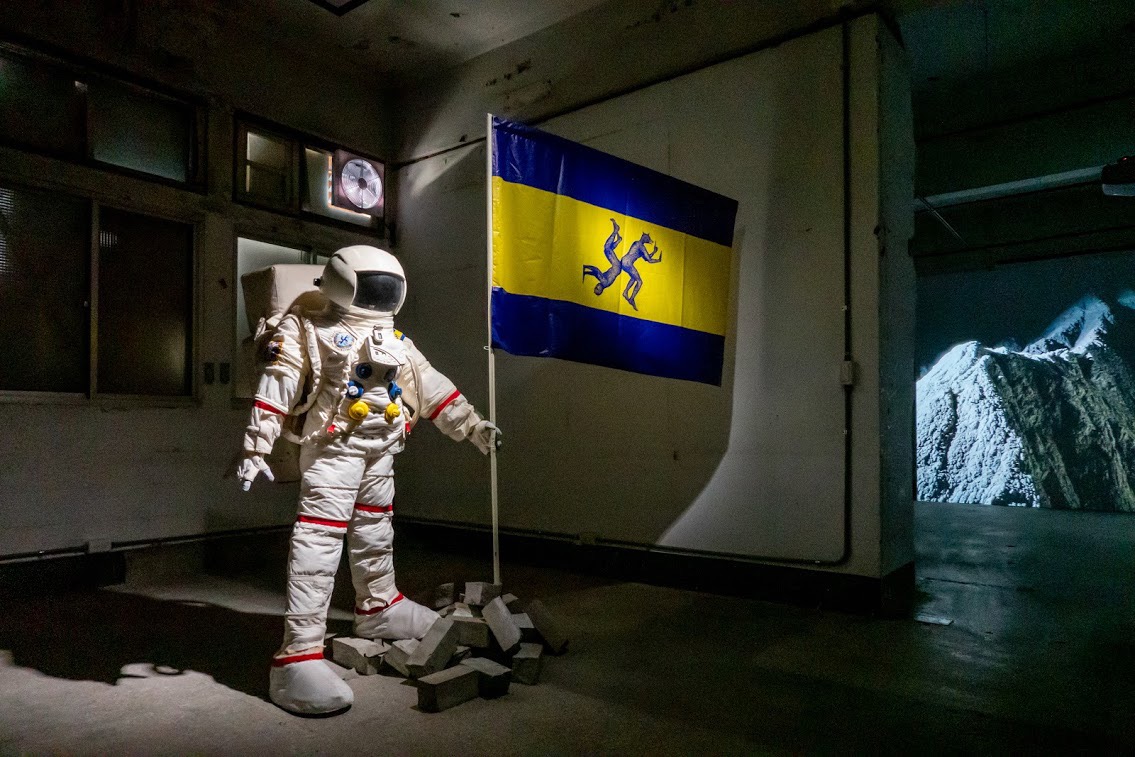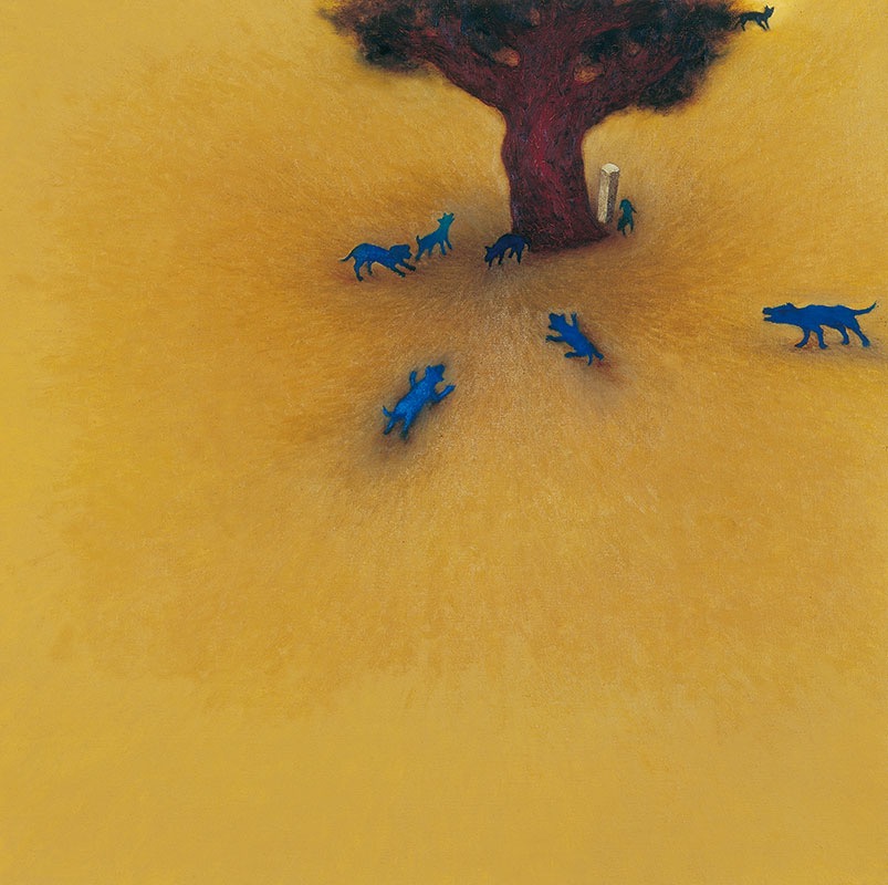 姚瑞中的狗頭人身,在「犬儒共和國」(2020)一展裡面,成為了旗幟上面的標籤。這個兩兩一對、屁股相黏的圖像,最早可以對應其早期的《犬儒外史》(2004)裡一張相似的繪畫,上面寫著「屁股對屁股,肛門對肛門」,下面則寫著「People to people / Government to government」,勾勒出台灣詭譎多端的國際情勢。而畫面中那兩個互貼的狗人,似乎也隱喻了兩岸之間各種虛情假意的政治人物;這種以狗暗喻政治嘴臉的作法,在蘇旺伸那邊則變成了對於人民無力感的抒懷。蘇的繪畫具有高度的寓言性,以及強烈的反烏托邦的氣氛。透過流浪的狗與貓,加上其他各式各樣的動物,共同存在於黃土一般的乾燥、扁平的背景上,好像為我們指出了未來的去路,如同喬治.歐威爾(George Orwell)在《動物農莊》(Animal Farm)中所託寓的,那種人類集體活在極權制度下的處境。畫家透過繪畫反映出了的當代政治對於一般人所形成的各種衝擊,人或多或少都變成了動物。