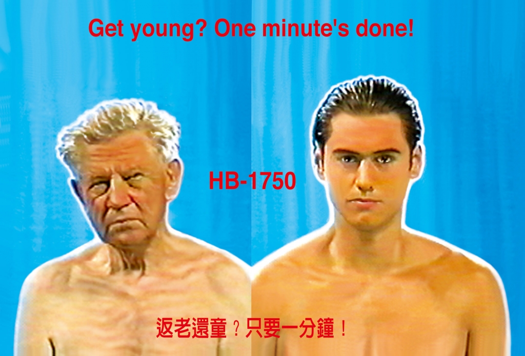 王:《聖光52》是一系列攝影作品,因應數位化時代,一組看似旅遊照片的圖像,透過些微影像重製去達到超現實的生活意境,提問了影像的虛實辯證,並且再一次強調了現實與幻象之間的距離。而《HB-1750》則是賣仙丹,當時,我將這些作品展示於西門町的一些商店內,以金色盒裝的方式呈現,讓人吃了變年輕。我想,長生不老應該是人類最為根深蒂固的慾望吧!