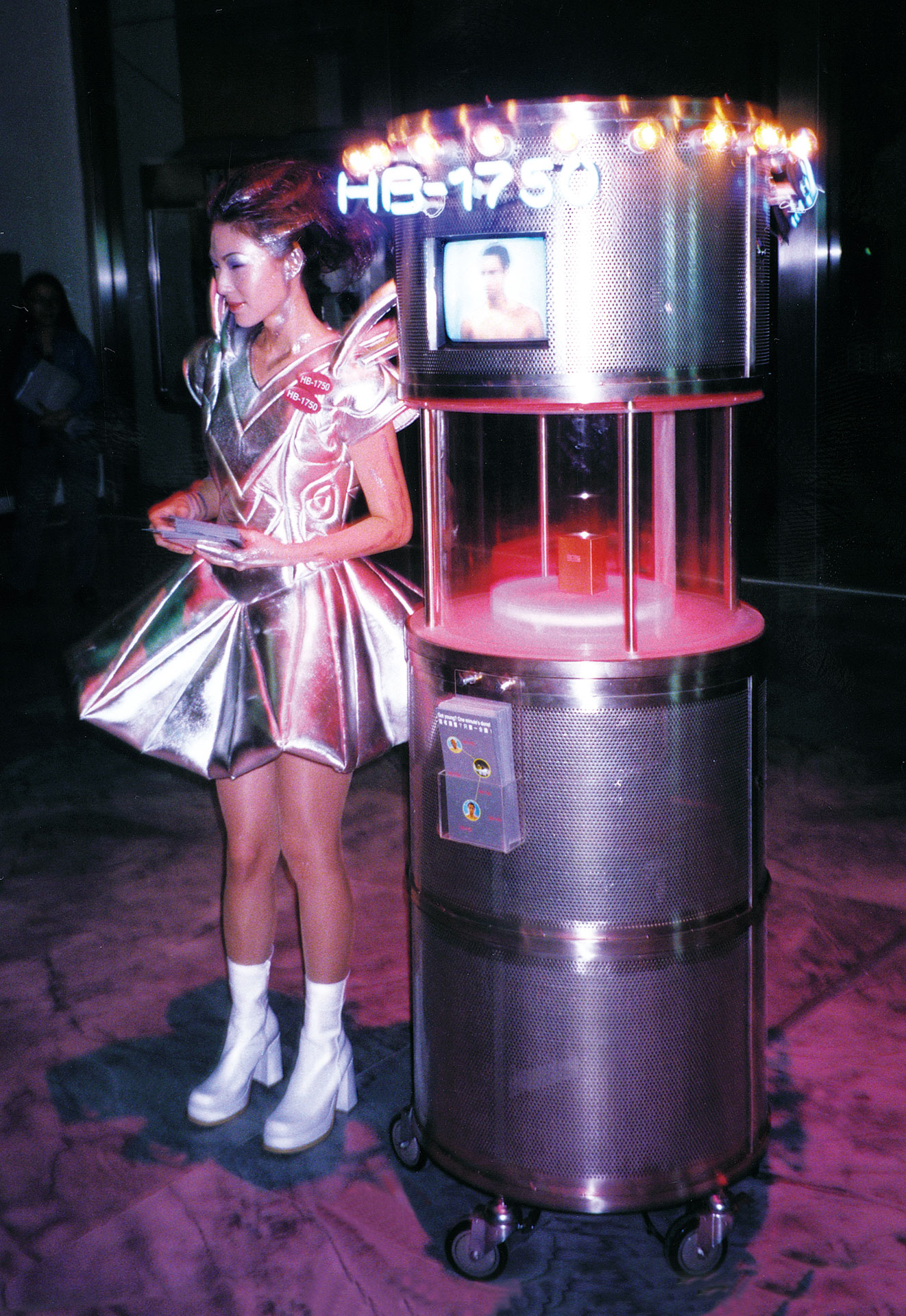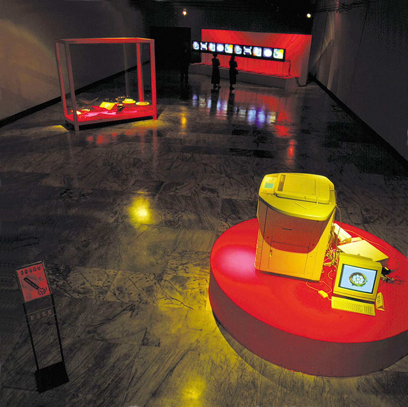 王:談及《十三日羊肉小饅頭》就要回到我早期創作歷程中的一個轉折來切入。1989年我前往德國柏林唸書,同年,柏林圍牆倒下,接著東、西德合併以及東歐共產國家如骨牌般地瓦解,此劇烈政治變遷對當時的我而言是一個相當大的衝擊,也因此開始了一系列非常極端的創作,例如歐洲時期所創作的第一件作品《奪命妖姬─第三代奧狄塞》到《霹靂浪子情─第四代奧狄塞》等,皆是當時相當激進的嘗試,試著打破所謂當代錄像的既定形式,牴觸無劇情敘事的錄像藝術法則,並透過作品表達了我當下的狀態。其後漸漸衍伸出《十三日羊肉小饅頭》的前身作品,如《龍鳳富貴吉祥如意拼盤》、《清湯虎丹》、《特價超級錄影帶》以及《中國神秘宮廷菜》等,開始探索消費文化與階級意識之間的關係。直到1994年在台北市立美術館大型裝置個展覽中的《十三日羊肉小饅頭》,對我而言這是個人美學上的一個轉捩點,看似一件既通俗又浮誇的創作語彙,我所欲提問的,就是難道意識形態與美學形式兩者之間無法對話嗎?在台灣面對藝術的分流不是商業性就是批判性,然而這之間只存在著如此的二分法嗎?因此,透作如同電視廣告手法的作品呈現,主題的陳述談及現實與幻象之間的抽象距離以及游離於中間的擺盪,並對科技時代的高度消費文化進行批判,這件作品也同時開啟了之後1990年代一系列的虛擬商品創作形式。