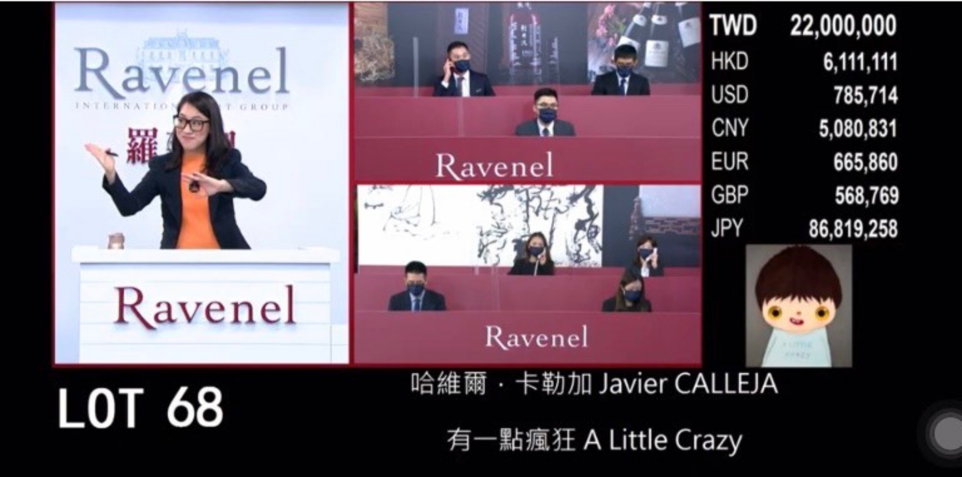 7月17日下午登場的「薈萃國際:現代與當代藝術」經典的封面拍品哈維爾.卡勒加(Javier Calleja)《有一點瘋狂》,起拍價為新臺幣1,700萬(以下成交結果皆為新臺幣),現場眾多電話競價,在隨階數爬升至高位全場屏息驚呼下,最終在2,200萬落槌,總成交價2,640萬 。該作亦突破上月在香港拍賣紀錄,成為藝術家個人全球次高成交紀錄。