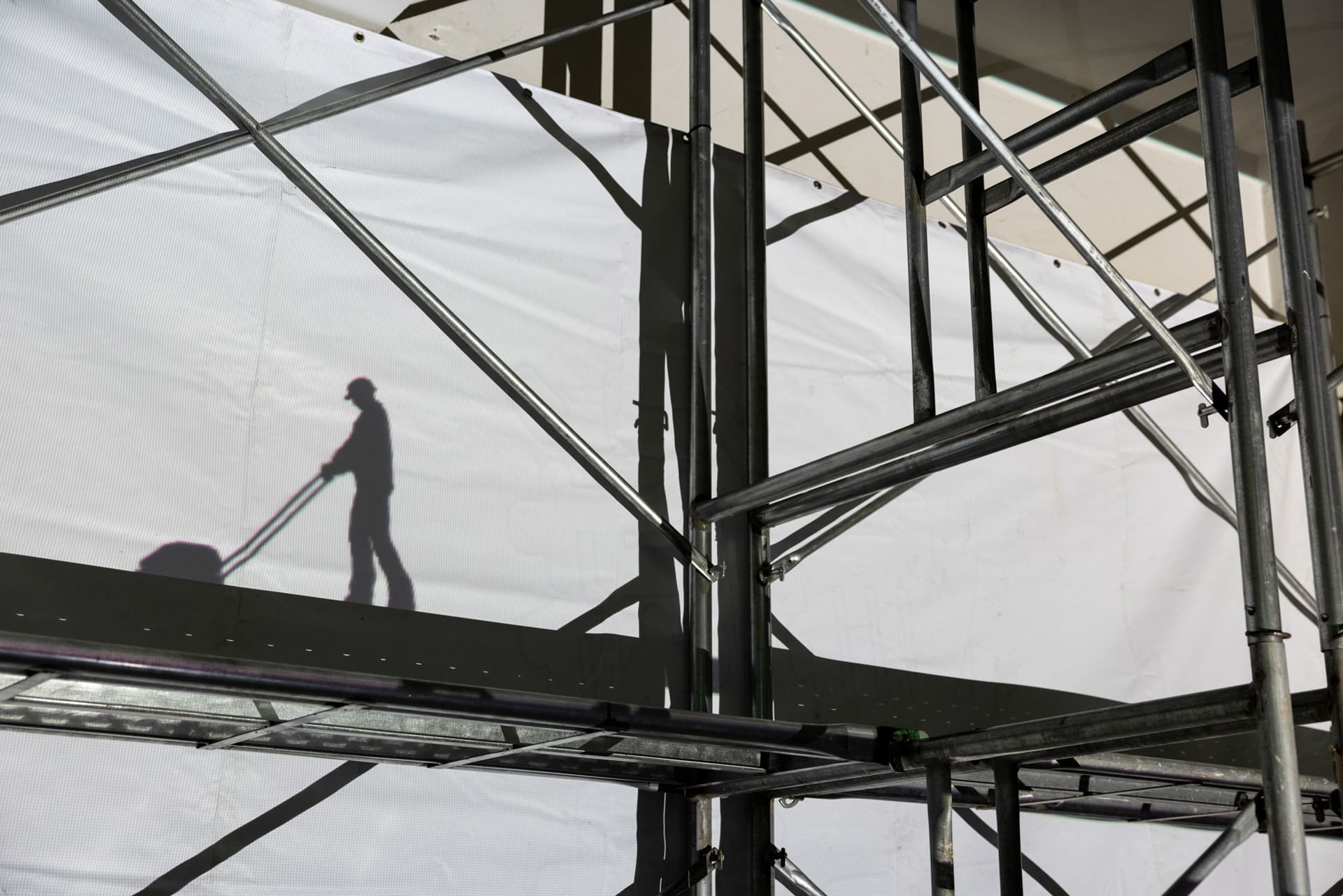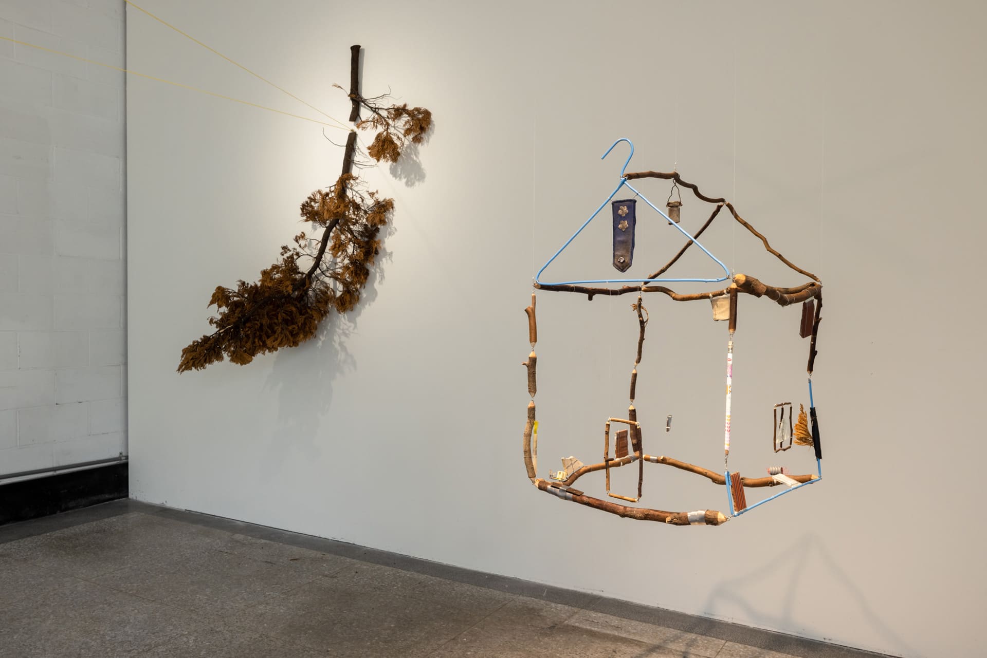 「勒法利計畫」以兩條軸線面對「空總園區」與「地方」意義,並將「folly」的空缺意義投射到C-LAB和展覽現場的美援大樓。從陳萬仁《冗餘物語》以行進中建造城市工人形象的光影,結合美援大樓展間現地的風景,提出一種對於C-LAB現況,無論軟、硬體的建設仍在過程中,並且疊合過去軍事建築的多重意義,成為一個從展覽本身到場域意義最為完整的註解。戴翰泓《從一個角落到另一個角落》,藝術家自述裡的一段「它沒有消失,只是失去一個維度。」,令人觸動。透過屬於C-LAB特有的拾得物:松柏樹幹、樹枝、衣架、線材構成一懸絲的家屋造型,線材透過拾得物構成的結構,讓原本散落、毫無關聯的物件,透過如敘事般的實體線材串連,成為挺立可辨識的形象。