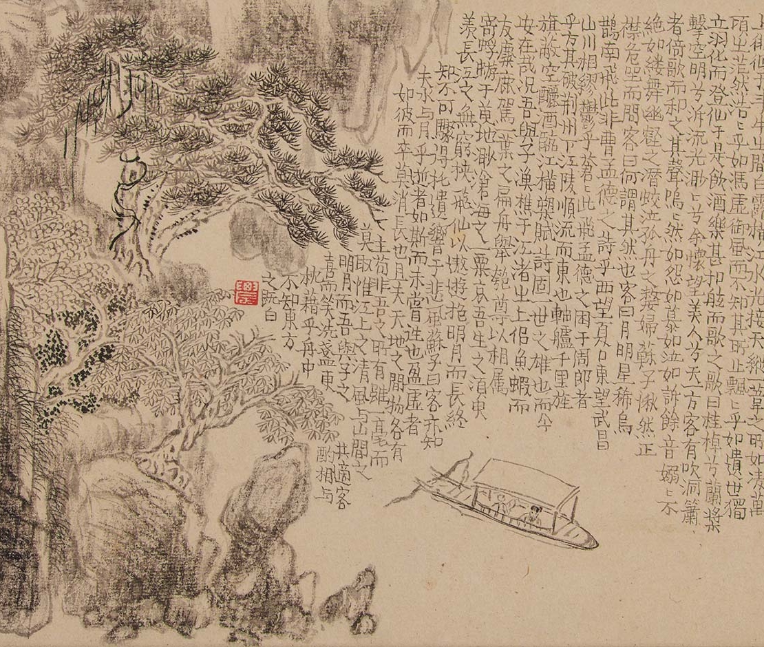 展覽中一套清代金農(1687-1763)所繪冊頁,也是引起觀眾討論的焦點之一,畫題包括東晉陶淵明(365-427)〈歸去來辭〉、唐代白居易(772-846)〈琵琶行〉、宋代歐陽修(1007-1072)〈醉翁亭記〉與明代宋濂(1310-1381)〈閱江樓記〉等歷代知名文學作品。此處展示的畫頁(圖7)以宋代蘇軾(1037-1101)〈赤壁賦〉為主題,畫家以其特有如金錯刀的渴筆八分書法,於畫幅右側全文抄錄撰寫蘇文。左方則圖繪文人雅士泛舟臨遊赤壁之景。整體布局大膽新穎,圖文雖填滿畫面,但不顯壅塞侷促。且筆墨色調質樸,流露雅緻古意,充分展示其個人對於詩、書、畫藝之天賦異稟。