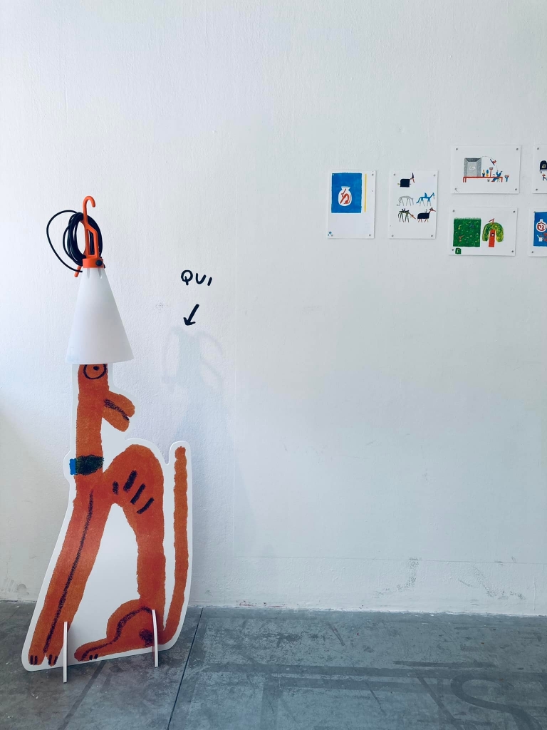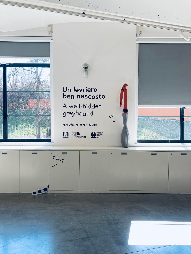 在波隆那的自由時間裡,因為同行創作者們的帶領,到處看了很多間當地的書店。在每間書店裡,都會碰到一本叫《A well-hidden greyhound》的作品,非常醒目,MAMbo波隆那現代美術館的地下室裡也進行著這本作品的原畫展。展間裡可以看到繪本的主角獵犬努力的躲藏在生活裡的各個地方,雨鞋裡、檯燈裡、花瓶裡。繪本裡提供了各種不讓總是緊張兮兮的獵犬動不動就被嚇跑的方法。