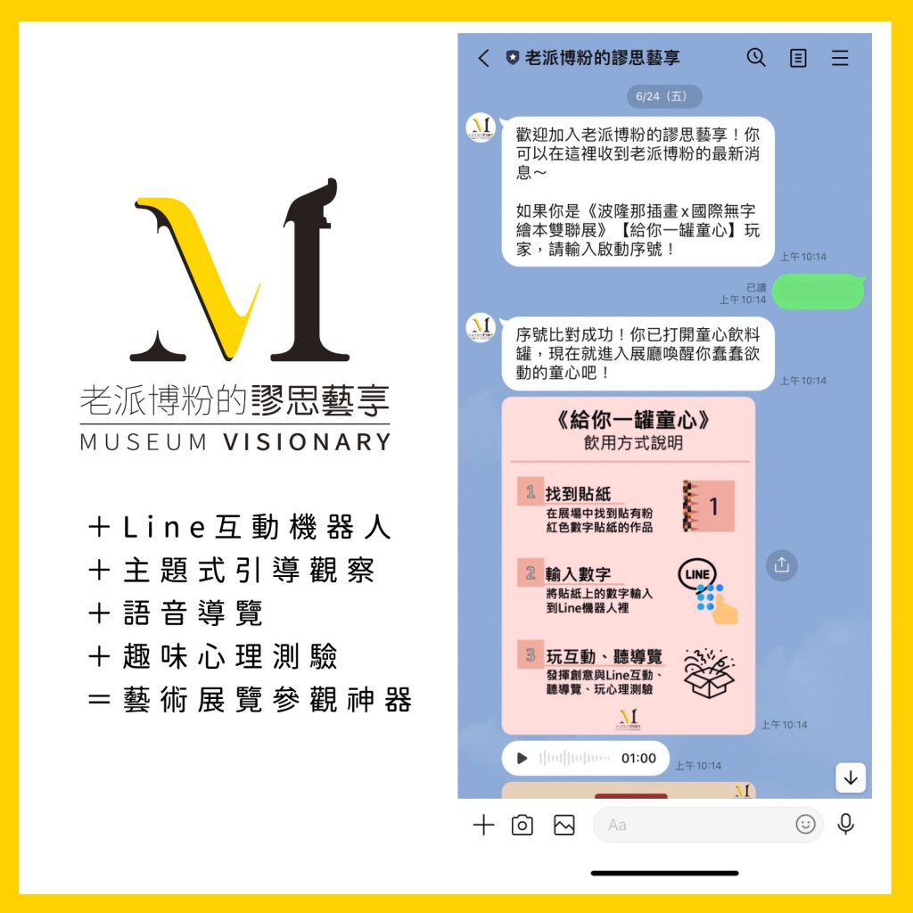 由老派博粉與翡冷翠文創合作開發的展場探索遊戲,是一項以雲端(個人手機取用)的遊戲式展覽參觀輔具,透過喚醒LINE機器人裡的童心飲料罐精靈,陪你深入觀察畫作、思考作品背後生命與世界議題的看展夥伴,陪伴你重拾內在的純真、想像力、好奇心等童心元素;以結合吸收新知與體驗「遊戲式自主探索」,創造獨有的自我療癒時光。