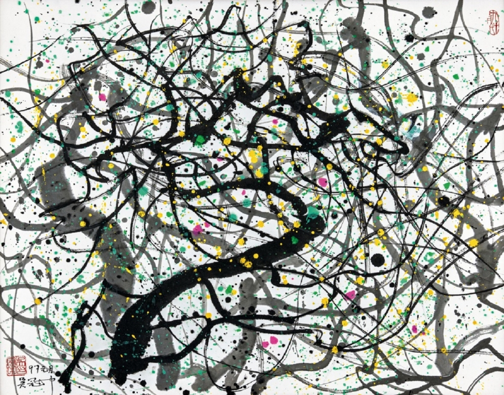 在1970年代,謝景蘭於巴黎開創集音樂、舞蹈、繪畫合一之「綜合藝術」先河,是次呈現的《花之舞》正為其若自畫像般的生命寫照。在低限用彩的畫布之上,她以流暢縱橫的書法筆勢,一氣呵成繪就一朵墨花,柔軟與堅毅並具,正如謝景蘭的人生。此作曾展於上海美術館、澳門藝術博物館的謝景蘭回顧展,並被收錄於五本權威畫冊,代表性不喻自言。