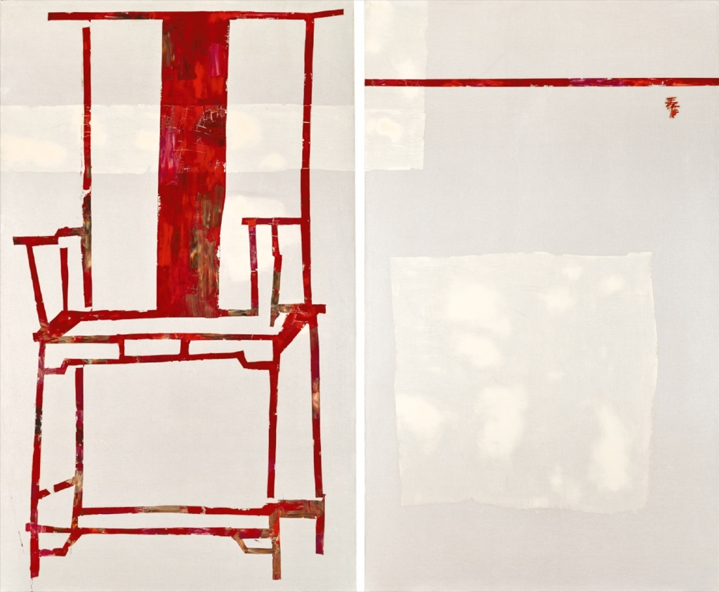 作品以瀲灩的紅彩與白為主色,左聯刮刀與畫筆並用,以精煉、遒勁的線與塊體,描繪了一張明式官帽椅,透露堂皇、偉岸的氣息,此一象徵傳統中國智慧的戴體,若堂皇的一家之主,一個「古老的中國」。而右聯則大膽地以一根紅線貫串左右,此如風箏不斷線般領人通往充滿無限可能、開放的「未來之境」,瞬時間貫通古今,引人心靈的震撼及懐想!綜觀王懷慶畢生創作,主體使用朱紅色調者不足20件,而當中以「紅椅」為主角者,更是鳳毛麟角,突出了此作的稀罕性。