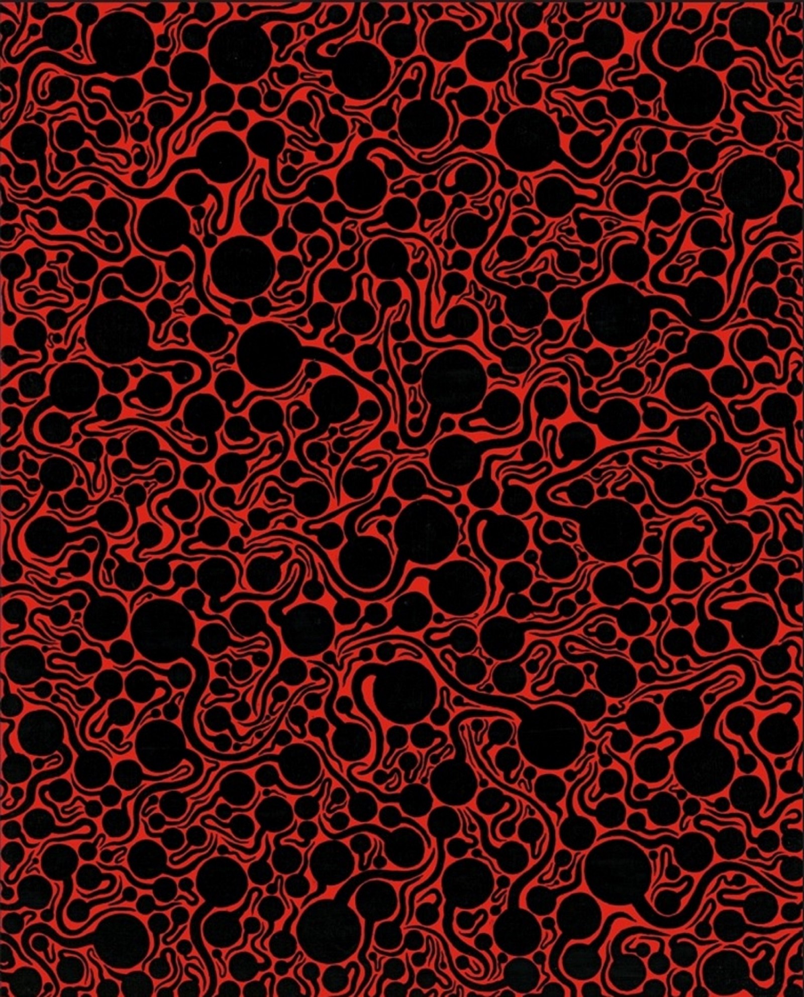 而在《夜的靈魂》,草間彌生大膽將畫幅施以帶有生命脈動力量的紅彩,在其上將對她而言「和地球、太陽與星星形狀一樣,富有生命的圓點」加以線條,生成大小不一如蝌蚪的浮游生物,或帶有希望象徵的豆芽,集結成充滿動感的迴旋之氣,示現著生命的旅程。而具豆芽符號之作在她畢生迄今創作中僅止12件,極為珍罕特殊。在完成此作的前一年,草間彌生在美國舉辦大型回顧展,並登上具高度影響力的《美國藝術》(Art In America)雜誌封面,為首獲此殊榮的日本藝術家,《夜的靈魂》無疑亦體現了她彼時對生命與藝術成就熱烈的歡慶和頌讚,意義非凡。