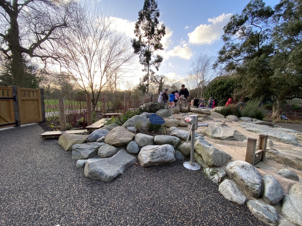 如前段所述,以原木為主軸,這個場域中主要元素,包含一個非常美麗的中空樹幹,瀑布和小溪,鼓勵⺠眾來玩親水遊戲,從比賽丟樹枝順流而下,或利用石頭和沙來堆小水壩等,也吸引更多生物前來聚集。