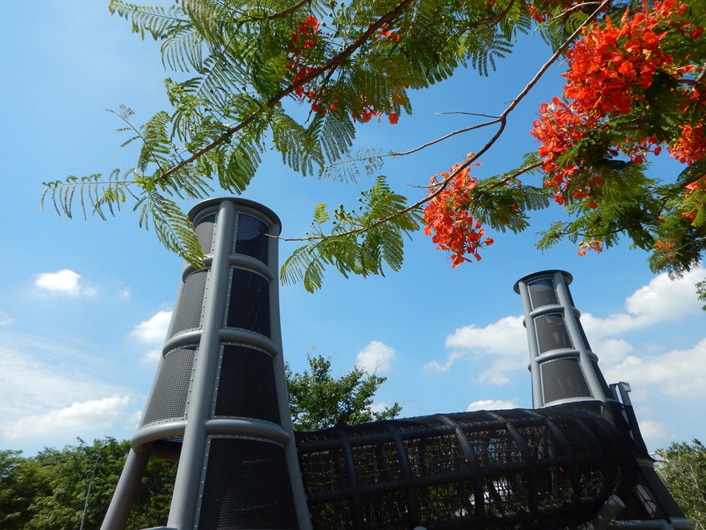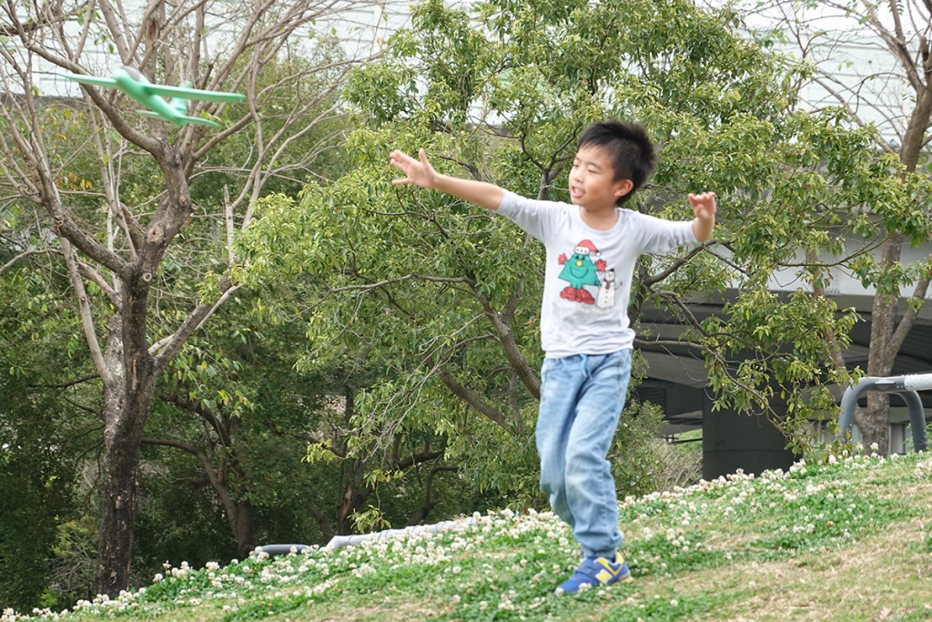 另一方面,保留原有的喬木包括小葉欖仁、茄苳、大葉榕、雀榕、垂榕、水黃皮、台灣欒樹、梔子花、鳳凰木、山櫻花、阿勃勒、楓香、羊蹄甲、印度紫檀和苦楝。成為公園的綠色基盤之外,又兼具遊戲性、五感體驗,讓孩子感受自然的四季變化。青剛櫟的果實,是可愛的遊戲元素;光臘樹,則是受兒童喜愛的昆蟲 — 獨角仙 — 最愛的食物。流蘇的白花,在四月落下,成為孩子賞花、玩花的好時機。七里香、梔子花的香氣,總是吸引著孩子把鼻子湊上去聞。更意外的是,草皮上一朵一朵的可愛白花苜蓿,是每年春天都會來華山大草原報到的白色小野花,除了是孩子玩扮演遊戲時的素材,更增加自然野趣的驚奇感。