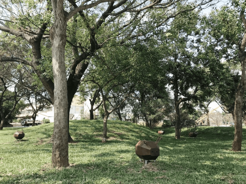 再向南走,轉到台中市的案例,吳書原設計師在台中大雅原住民族生態公園介紹文章中,提到自己的設計:「⋯⋯新植的原生民俗植栽,如山蘇、密花苧麻、假酸漿等,以自然元素呼應原住民的生活意象。除了創造生態棲地和微氣候⋯⋯ 以陽光草皮和地景土丘,提供大人乘涼、孩童探索、遊戲、奔跑的開放空間⋯⋯ 打造如山林地景的遊戲空間。隱約出現 (在草坡上) 的木製動物,孩子奔跑穿梭在山林大地之間,跟自然對話、跟動物賽跑 (圖 9)。」