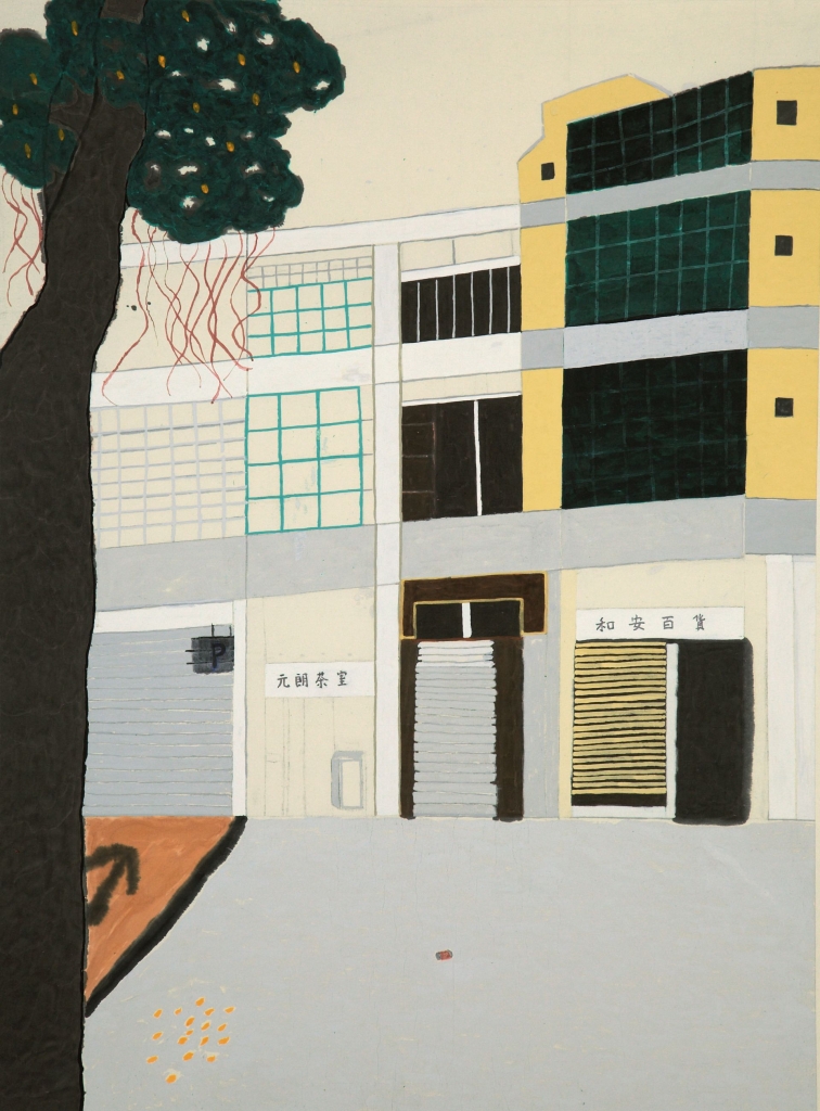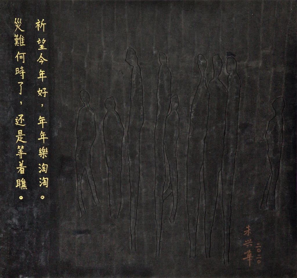喜以香港城市景色入題的朱興華,近作也捕捉了疫情下的社會面貌。他以特色的漬染手法抽象地繪下《病毒》,切中時事又不乏童趣。其中《鴉雀無聲》更是他與孫兒聯手合作的繪畫,畫中左下方的箭頭、黃葉和中間的鐵罐都是出自孫兒之手。清雅潔淨的構圖背後,隱藏著爺孫合作的親子時光。好幾幅近作用色都頗為暗黑,尤其以 2020 年《黑元旦孤獨人行》畫中低頭行走的人,情感上最為消沉。《災難》乍看起來更似是一片漆黑,隱約可見幢幢人影。藝術家的心情溢於言表,還化成書法於畫上題字,直問「災難何時了」。