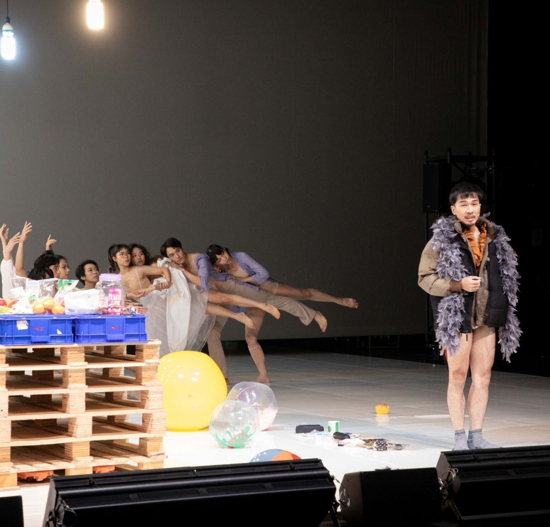 我們再回看《超級市場Supermarket》和《不知邊際、不知所謂事件》兩作的「複詞技術」,在《超》作裡我感受到它多焦紛呈的樣態有聯綿詞的意圖,但在偏義複詞的掌握度則出奇地優異。在《不》作裡,從作者受藝術節WIP的連續作品意圖,感受到的是對同義複詞的一種抵制或幽微的抵抗,可能是相對追求現場技術的聲光設計反差,卻在疊韻的技術方法隱然地呼應到。然而,現場藝術所追求的擾動感,在近年來各種大小展演的策展方法配置下,其實已經進入了一種強弩之末感。