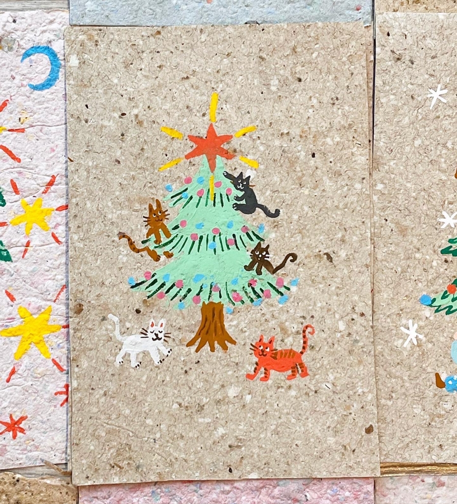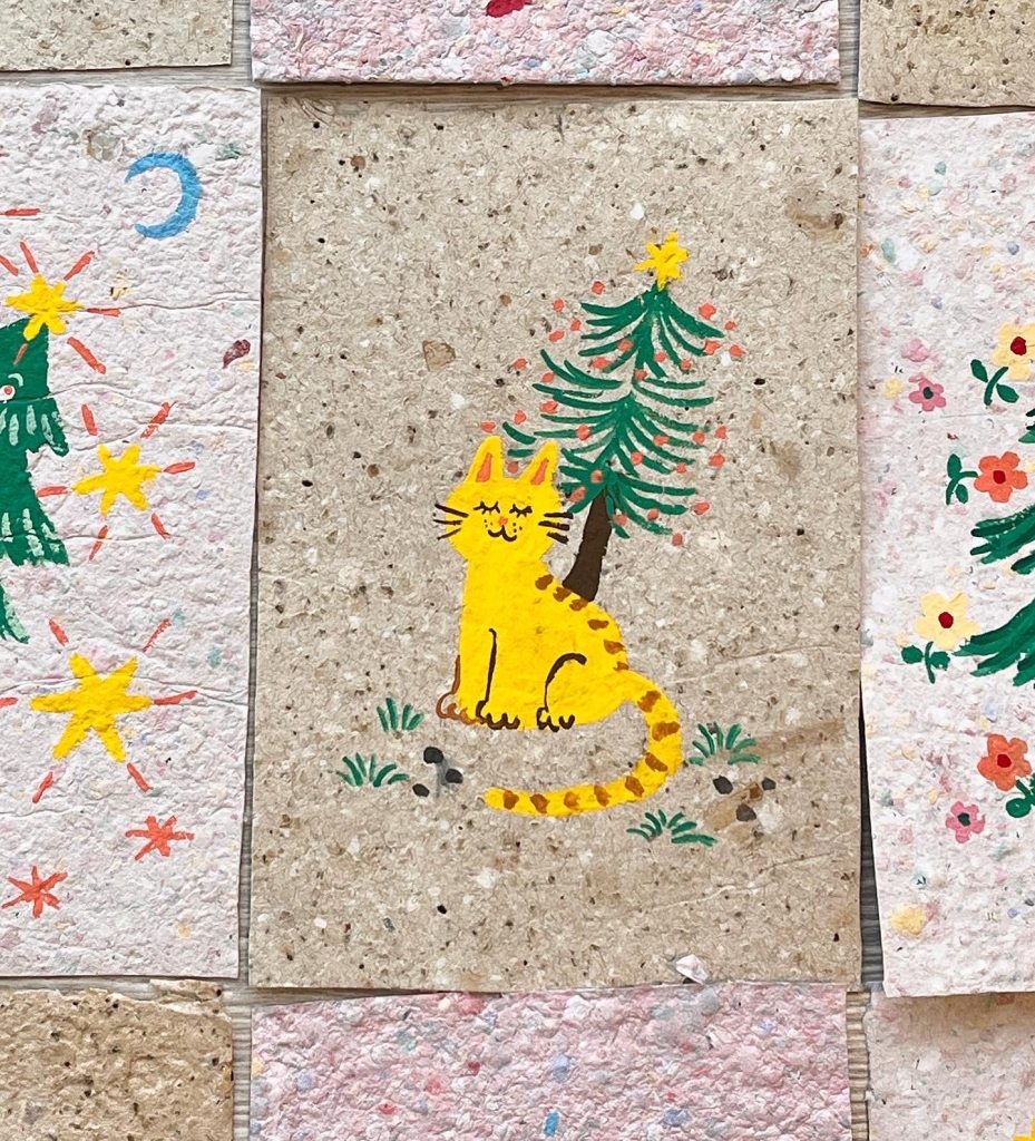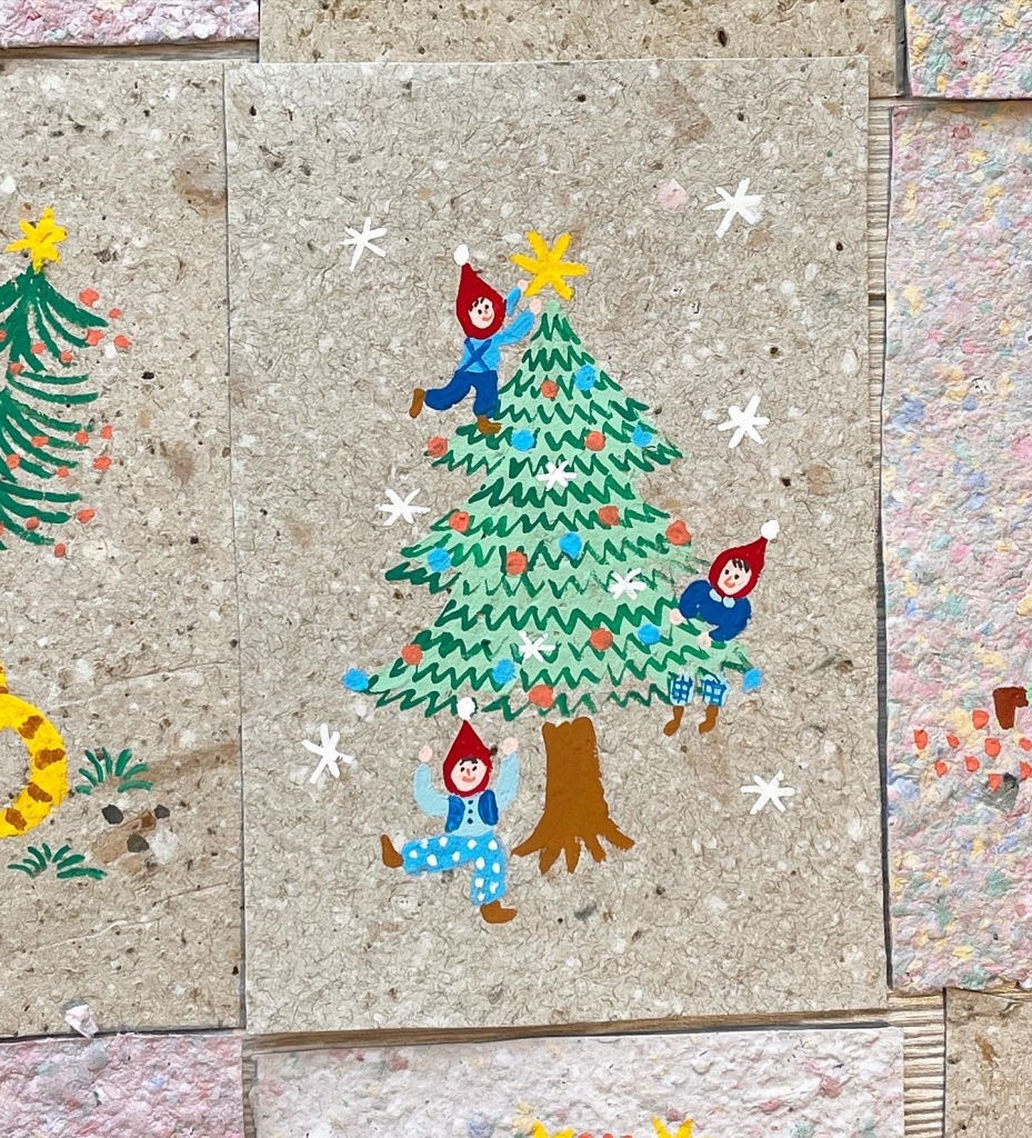 「為地球種棵聖誕樹」的公益計畫使用的紙張,是廢紙張回收後把紙張加水,打成紙漿,經由手工再製成的「手抄紙明信片」,之然再每一張親手手繪聖誕樹在明信片上。公益計畫義賣一張明信片的所得,將捐至一個國際種樹組織 Plant for the planet,為地球種下五棵樹。