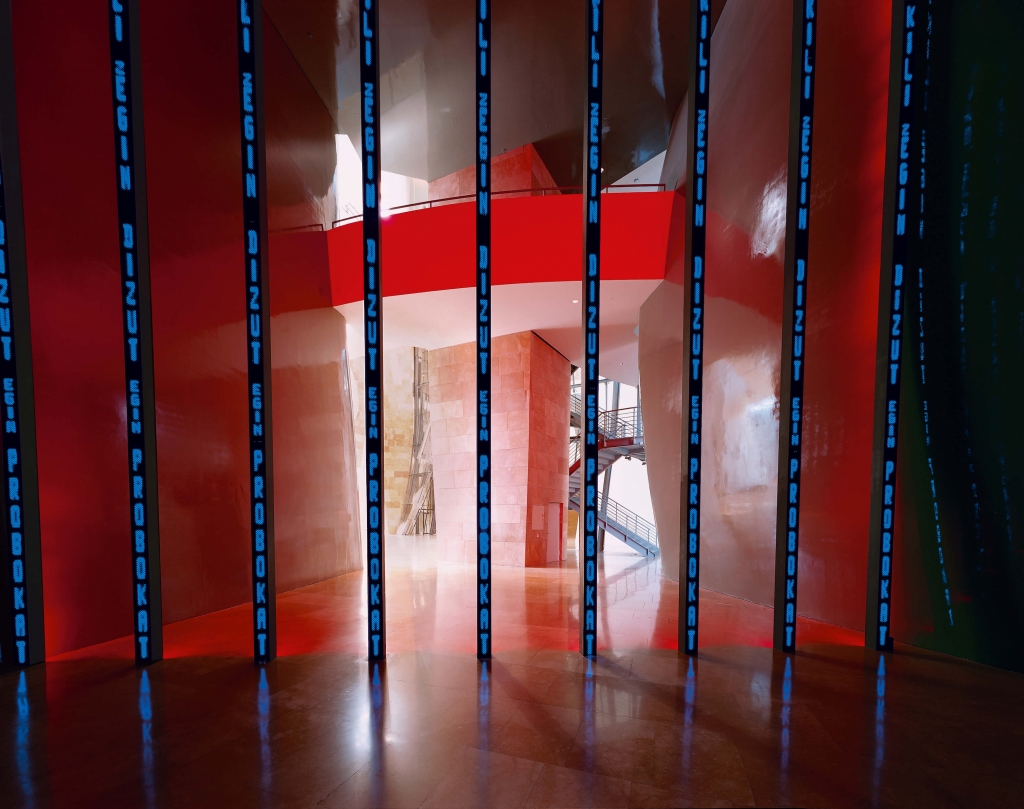 畢爾包古根漢術館是一間展示當代藝術的美術館,戶外展區除了有精采的大型裝置藝術外,室內的展區也很精彩喔!首先進入一樓的101展間時,可以看到九個從地板直立至天花板的雙面LED面板,每個面板都超過12公尺,當紅色、藍色的文字不斷在跑、閃爍時,你除了接收到許多訊息外,是不是也感受到一種氣勢磅礡的感覺呢?《INSTALLATION FOR BILBAO》是由美國藝術家珍妮.侯哲爾(Jenny Holzer)所作,她常將自己的思考用語言的形式記錄下來,或擷取經典文學、政府文件中的文字,利用LED投影等技術,以文字的力量,探討各類主題。