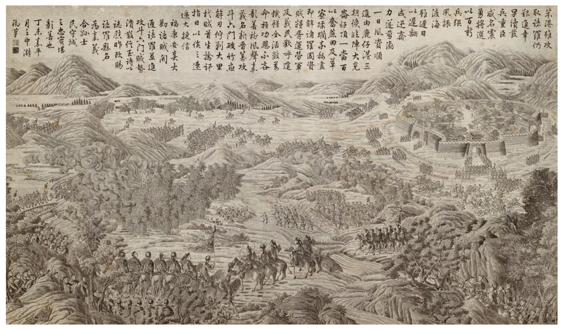 The background maps completed in Taiwan gave meticulous detail to the strategic passes, terrains, rocky mountains, villages, houses, enceinte, woods and of course war scenes, (…) these illustrations convey Qing Dynasty’s control over the land as a valuable piece depicting the historical and political landscape of Taiwan at that time (Hsueh 2011, 38). (Note 14)
