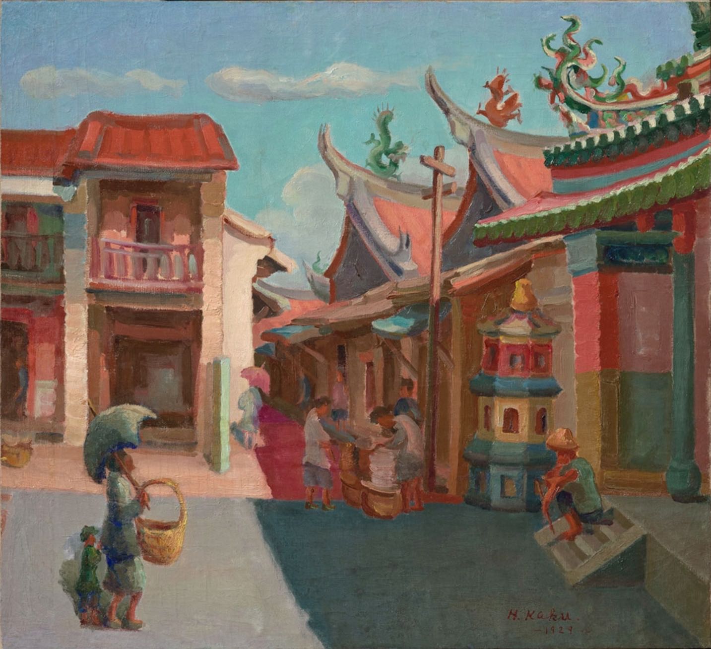 The shadow of the temple divides the picture into two parts and creates a vivid interplay between light and shadows. The woman with a sun umbrella strolling around the plaza, the street vendor with his customers, and a man resting in the shade make up the scene of an afternoon of leisure in Tainan (TNAM No. 4299). (Note 26)