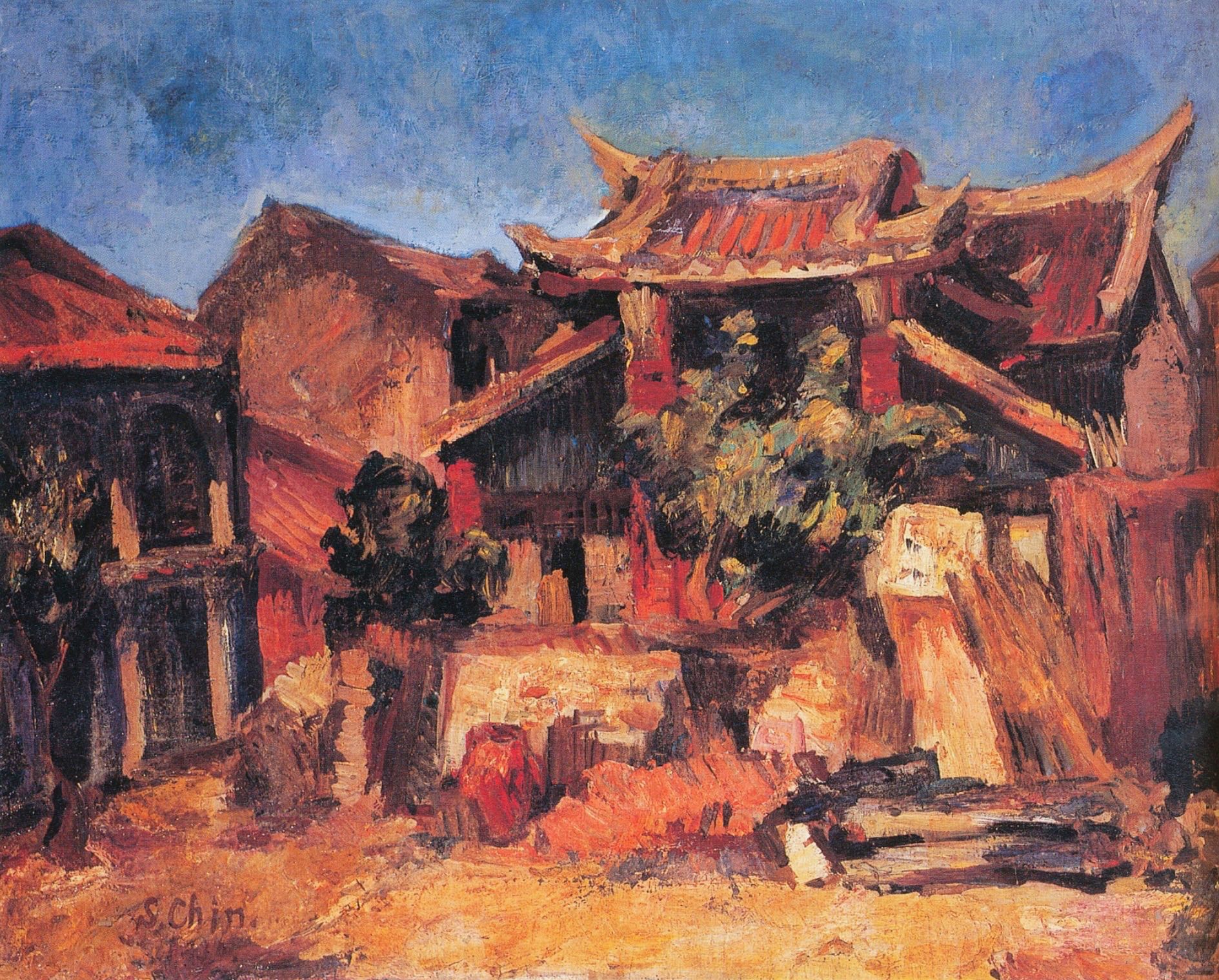 In the middle ground, he used layered brushstrokes to form various color blocks, reddish brown or dark green. The ancient temple, the verdant shrubs and the slightly disordered scene are simplified by the painter’s intense brushstrokes, exuding a vibrant momentum. It seems to announce that the headquarters of Taiwan People’s Party is established at the center of Tataocheng (大稻埕), and the fight of Taiwanese people continues (Chiang 2022, 146). (Note 28)
