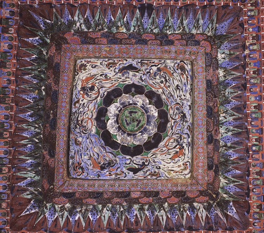 也因為如此,「三兔共耳」除了圖案富有巧思,更憑添了一股神祕的氣息。但更令人感到困惑的,則是「三兔共耳」出現在遙遠的敦煌莫高窟當中。「三兔共耳」圖像出現在敦煌莫高窟的藻井圖案,分布年代從隋代到唐末。據學者統計,目前為止可知有16窟內部繪製「三兔共耳」,皆是天井圖樣的一部份,後來又有學者發現有兩窟出現「三兔共耳」,但圖像不在天井。其中隋代洞窟有6座,比重最高。