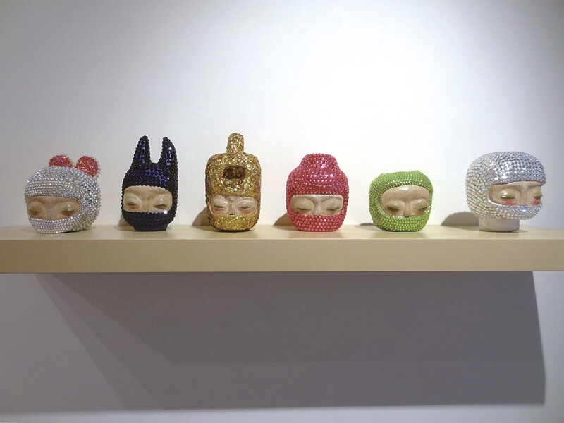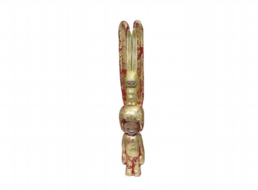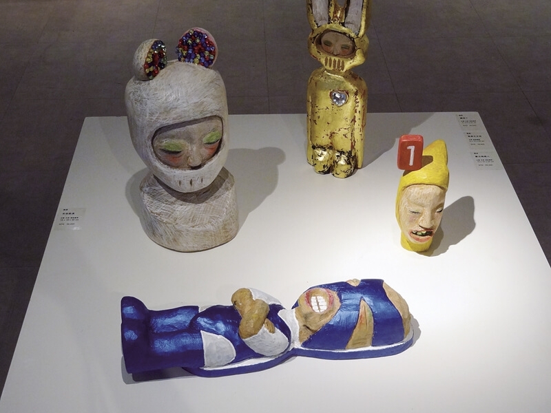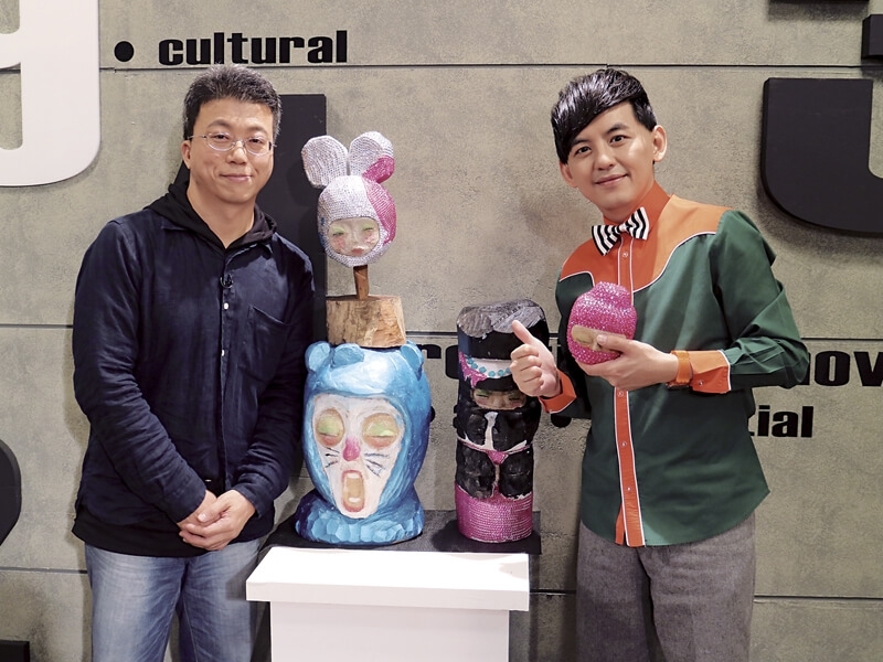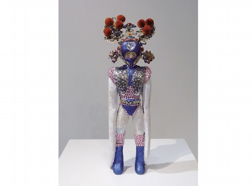 第一次遇到王老師的作品是在藝境畫廊,當時被他的木雕深深吸引,除了角色造型充滿童趣,但又略為奇妙,含有神話/動漫/宗教/社會元素,甚至還將BLING BLING的假彩鑽貼上(因為他女兒喜歡),變身複合媒材雕塑品,更誇張的是把舊布袋戲偶的斑駁頭盔也結合在木雕,或是(類)神像上(爸爸是法師,媽媽以前也在廟裡工作過,很合理),氣場強大畫面新鮮。當日一問之下,原來翅男老師人在遙遠的東部,並且任教高中。