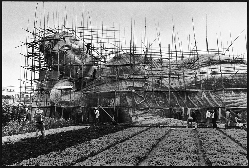 阮義忠《回家的路上》系列,在宜蘭河的河床上造佛像,宜蘭市,1982。圖片提供:阮義忠、阮璽