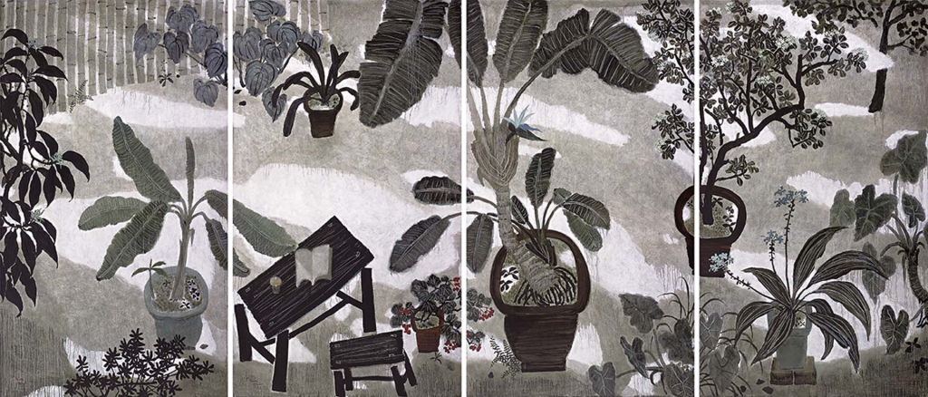 小蕙在2000年前後,以印象派風格所畫的老院子,那些畫面上透明亮麗的光影色彩,已讓我知道我的繪畫資質根本不能望其項背。其後她所創作的各系列作品,其內容之豐富也都令我詫異動容。2011年她製作了巨幅《樂道圖》雙連作,那種氣魄和造型張力,不但足以成一家之言,也達到了今人所不知的創作高度。2013年她又製作了老院子巨幅四聯屏《麗日微風》,至此她個人龐大的藝術創作體系已全部建構而成,我也一面倒地完全服膺於她的藝術創作能量。