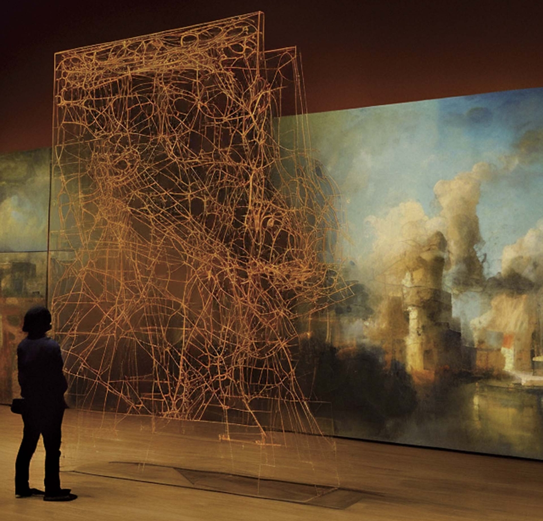 去年三月以前的生成式 AI 創作工具與現在已經差異很大,當時由於主流創作模型使用生成對抗網絡(GAN),常出現難以掌控的驚喜。張明曜的《最後的晚餐》利用反覆骰骰子的「對話」過程,農(遊戲用語,表長期累積能力)出反覆迭代的後設意向,暗喻修復與膺作之間的關係。張明曜在自述中說明:「《最後的晚餐》像是以自身的複製品圖像為提示之生成演算,不斷修復自身的同時,亦不斷丟失自身,在一次次的迭代中,越發偏離原作,卻也更逼近完美的贗品之軀。」