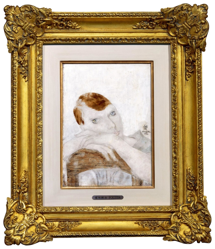 1913年赴法的藤田嗣治是「巴黎畫派」的重要一員。他以日本傳統侘寂、極簡美學為本,融入歐洲現代繪畫運動,將日本傳統浮世繪纖細的線描和潤滑如瓷漆器的平面性與西洋油畫的寫實技法結合,營造如夢似幻的畫面氛圍,使其一躍成為明治維新後,最具國際影響力的日本畫家。在1920年的秋季沙龍上,藤田作品中膚若凝脂的裸女驚豔了整個巴黎,被譽為「絕妙的乳白」。完成於1925年的《琪琪肖像》,正是他蜚聲巴黎的經典之作,更一展法國藝壇傳奇繆思、許多著名藝術家好友——身兼歌手、舞者、模特兒、演員的「蒙帕納斯女王」琪琪的魅力。目前市場可考藤田以其為主角的油畫作品僅只五件,而此次的《琪琪肖像》則是其中唯一的「金髮」人物之作。畫中琪琪戴上了她鐘愛的金色假髮,回歸一個全然放鬆的姿態,她纖長的雙手慵懶地交叉擺放在木質的椅背上,弓起的手背與雪白的雙臂烘托伊人的優雅之姿,似欲語還休般傾訴斯人心事,通過人物表情勾勒一出生動而親密的絮語;極細的墨黑線條勾勒其形,微微暈染的炭筆構築衣衫、皮膚上的陰影,令畫中的琪琪令人魂牽夢縈。